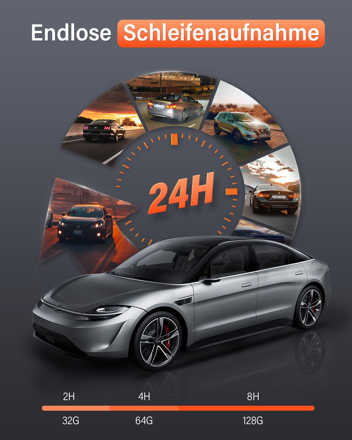 • G-СЕНЗОР И 24-ЧАСОВ МОНИТОРИНГ НА ПАРКИНГ И Цикличен запис — Когато G-сензорът засече внезапен сблъсък, видеото от сблъсъка се заключва и запазва. Новозаписаното видео на видеорегистратора автоматично презаписва най-старото видео, за да се гарантира, че SD картата има достатъчно място за аварийни видеоклипове. С 24-часово наблюдение на паркирането, видеорегистраторът може да записва непрекъснато в продължение на 24 часа в режим на паркиране, използвайки функцията за заснемане на ускорен кадър.