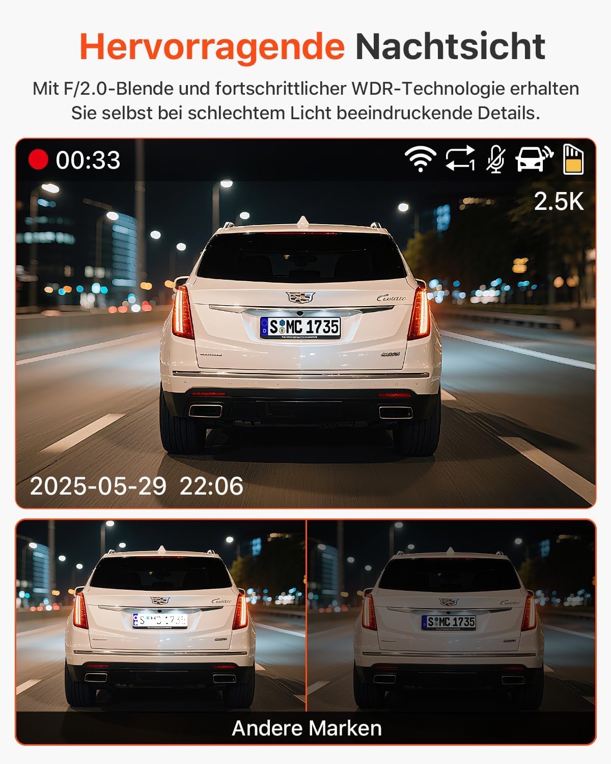 • ПО-ЯСНО НОЩНО ВИЖДАНЕ И 4 IR СВЕТЛИНИ — Предната, задната и вътрешната видеокамера разполагат с 6-слойна леща с бленда F/2.0 и WDR, която автоматично увеличава експозицията при условия на слаба светлина, за да заснеме ясни изображения. Отличното качество на записа осигурява по-силни доказателства в случай на инцидент. Благодарение на 4 инфрачервени светлини, водачът и пътниците могат да бъдат ясно разпознати дори в пълен мрак.