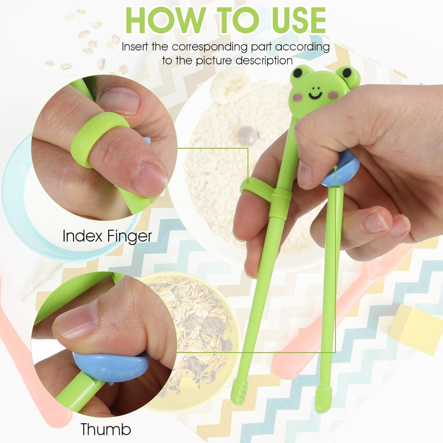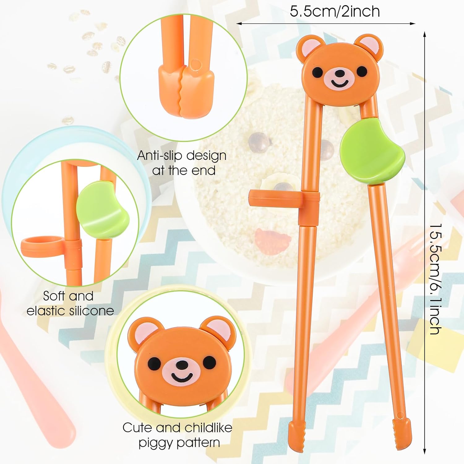 3. Предната част на нашите противоплъзгащи детски клечки за хранене има неплъзгаща се структура, така че оризът и парчетата зеленчуци не падат толкова лесно.