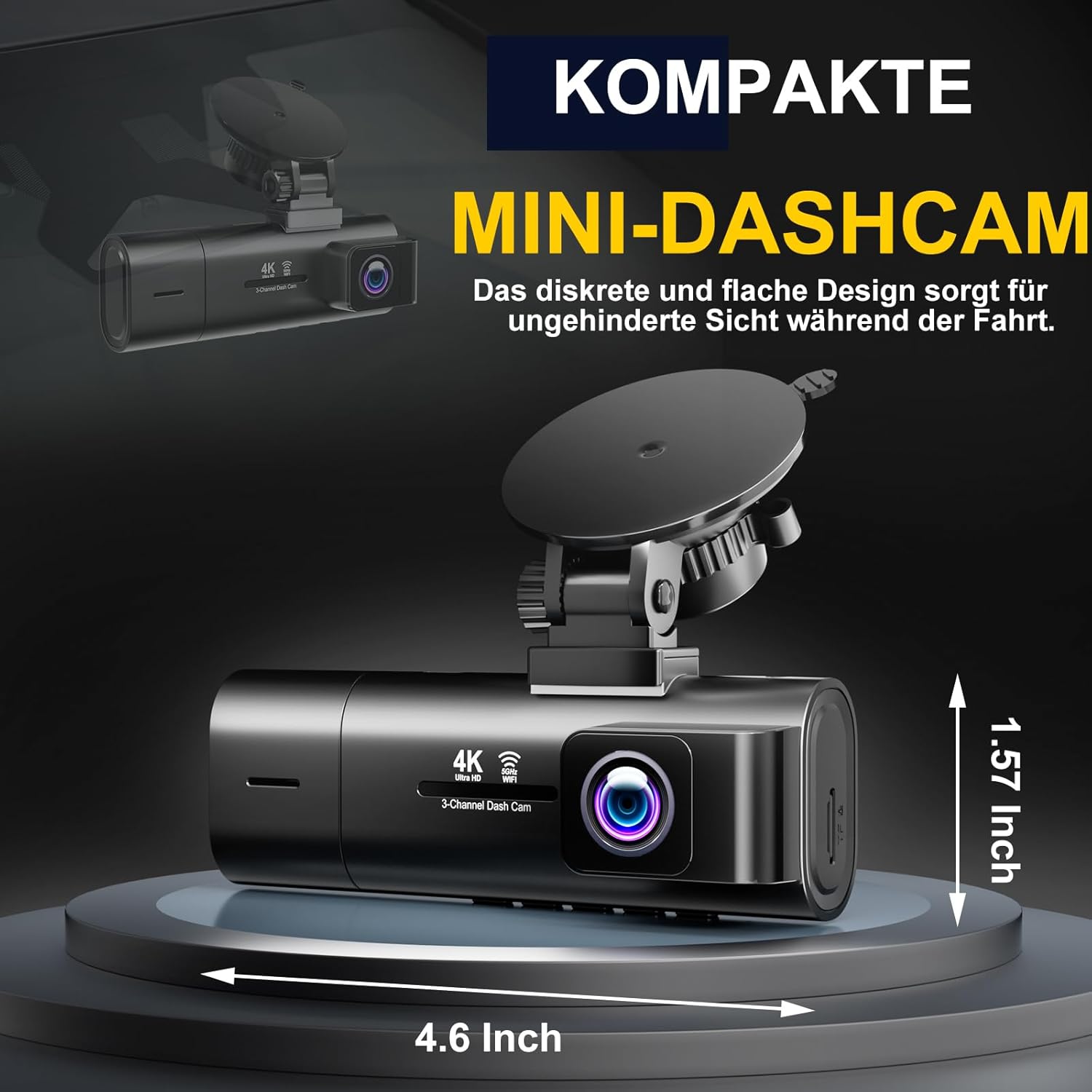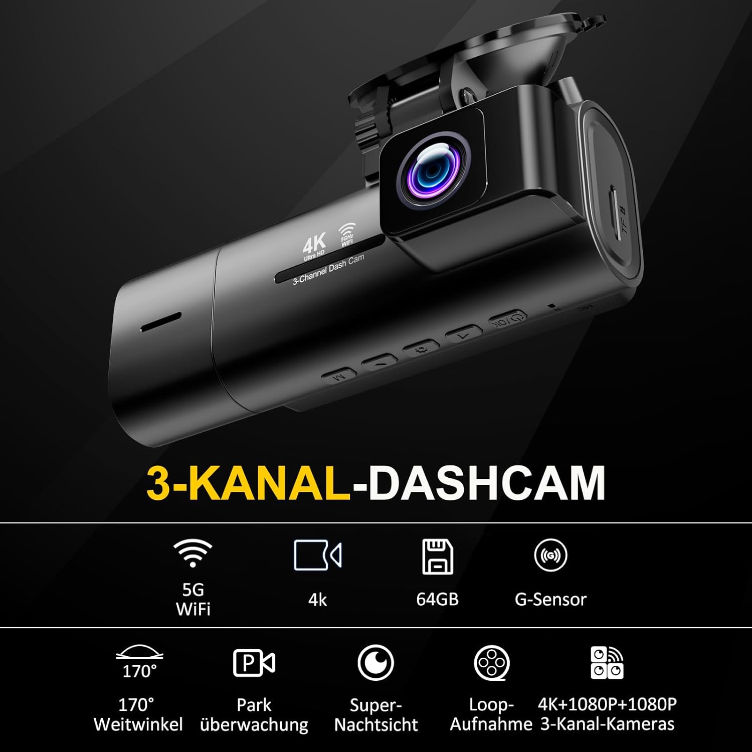 3-канална видеорегистратор за кола 4K+1080P+1080P отпред и отзад, 3.16" IPS екран, 5G WiFi с 64GB SD карта, нощно виждане, G-сензор, цикличен запис, 170° широкоъгълен ъгъл, 24-часово наблюдение на паркирането