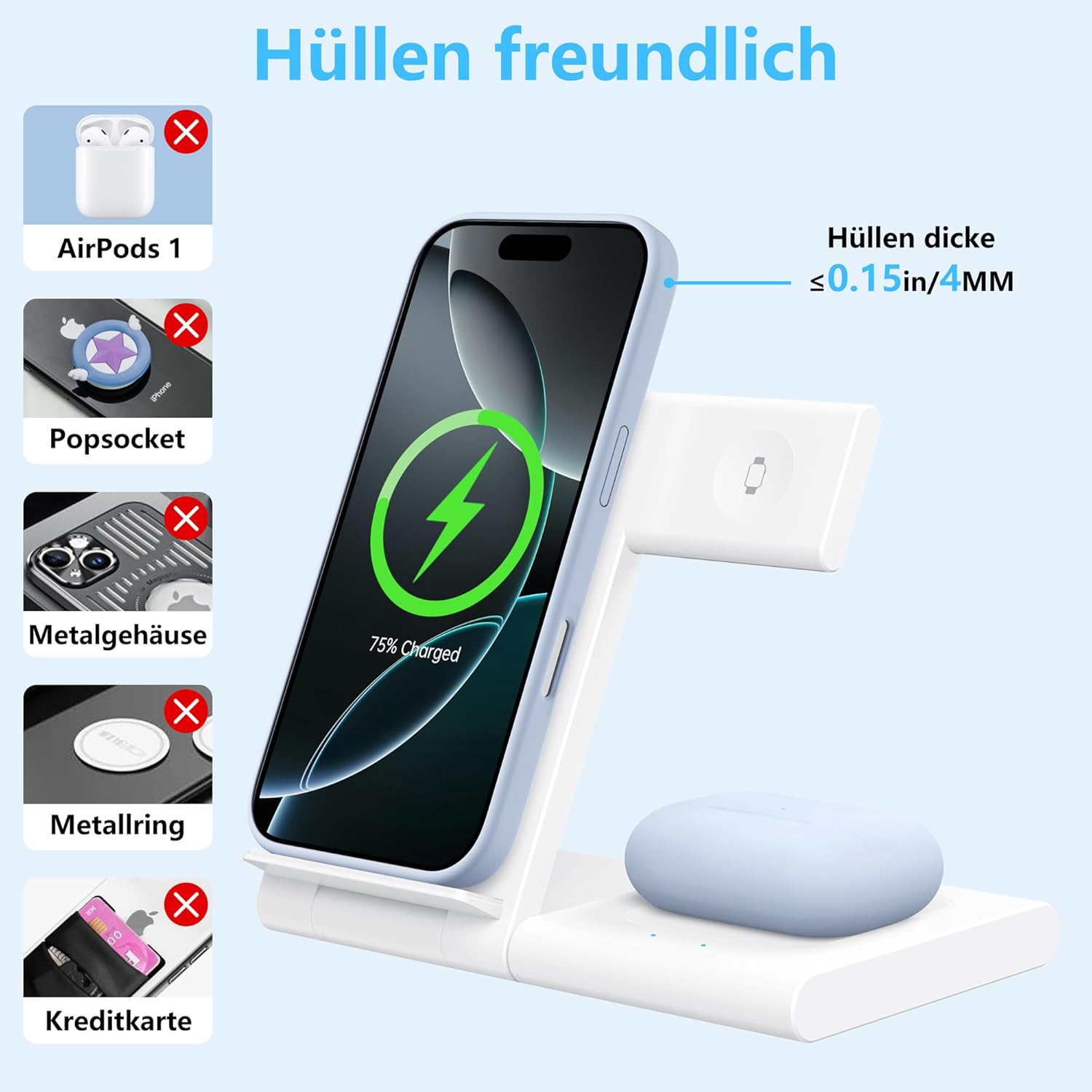 • 3 в 1 зарядна станция за Apple устройства: зареждайте вашия iPhone, Apple Watch и AirPods едновременно с тази безжична зарядна станция за iPhone и Apple Watch. Съвместима с iPhone 16/15/14/13/12/11 (Pro/Max/Plus), Apple Watch Ultra/10/9/8/7/6/5/SE и AirPods Pro/4/3/2. Перфектна за потребители на Apple, които търсят зарядна станция за няколко устройства. (Забележка: Не е съвместима с AirPods 4 без шумопотискане)