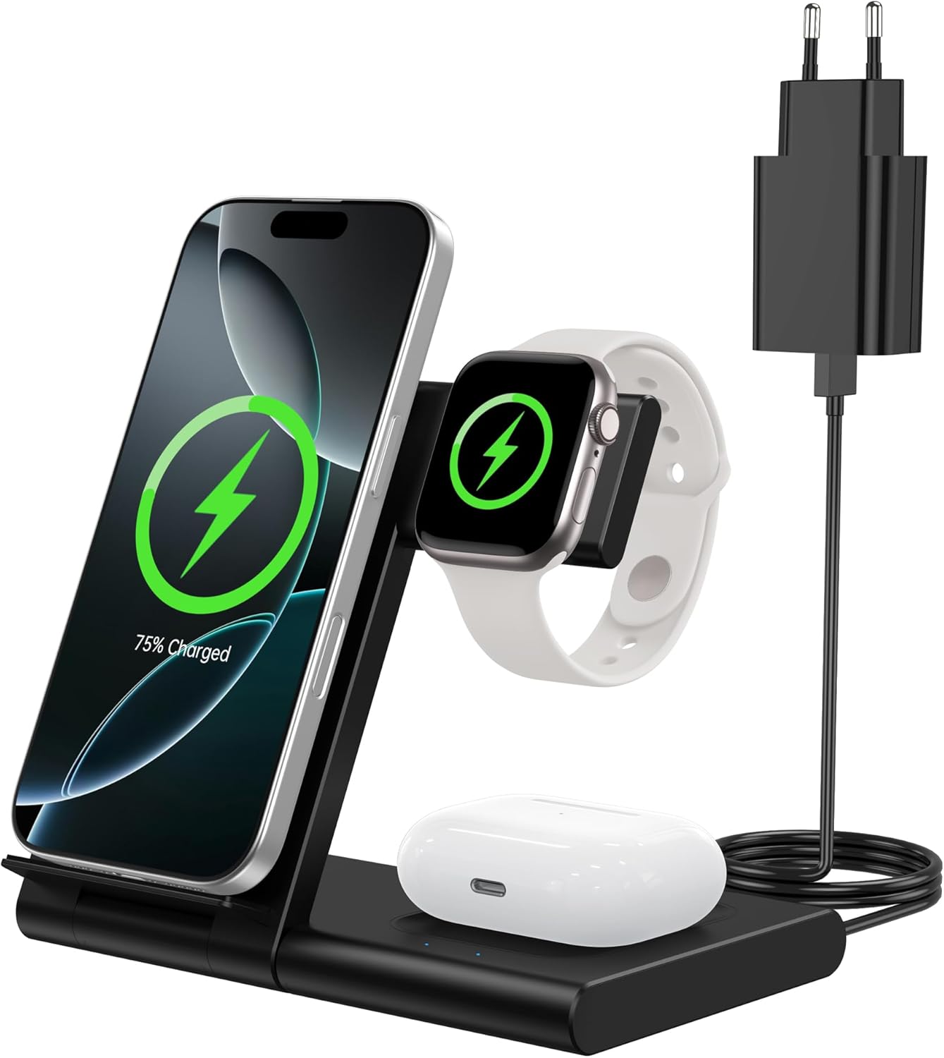 3 в 1 безжична зарядна станция за Apple Watch и iPhone, бързо зарядно устройство WATOE за iPhone 17/16/15/14/13/12/11/Pro/Max/Plus, Apple Watch Ultra 3/11/10/9/8/7/6/SE 3, AirPods Pro 3/4/3/2