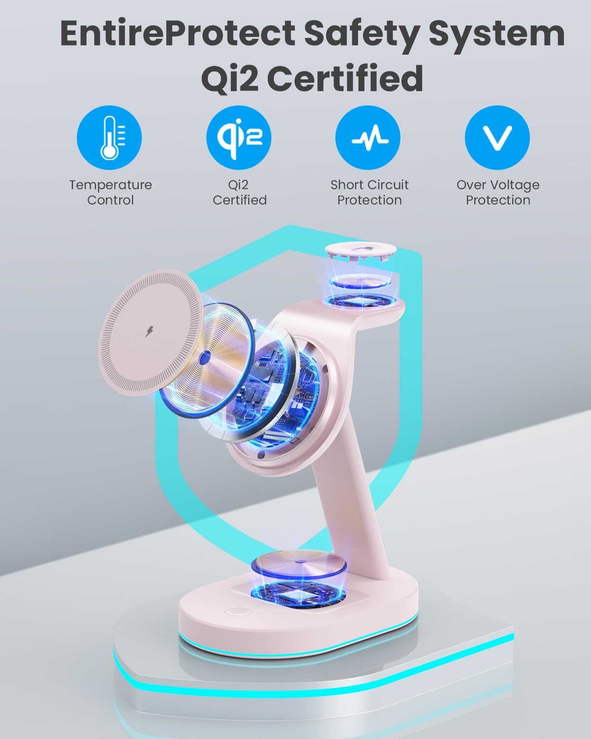 3-в-1 безжично зарядно устройство с индуктивна зарядна станция, Qi2-сертифицирана 15W бърза Mag-Safe зарядна станция с 30W USB C адаптер и нощна светлина за iPhone 16/15/14/13/12 серия, Apple Watch и AirPods
