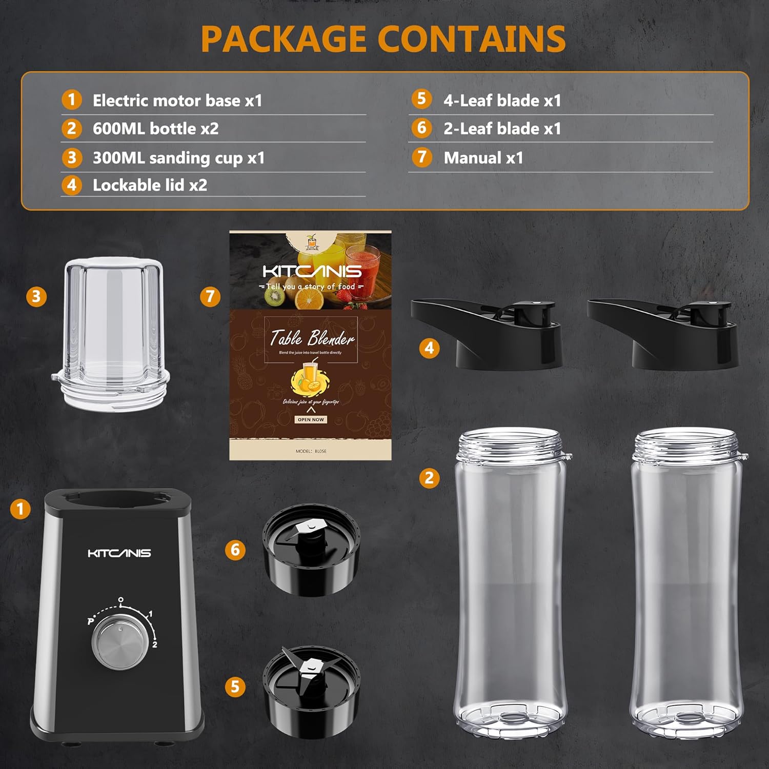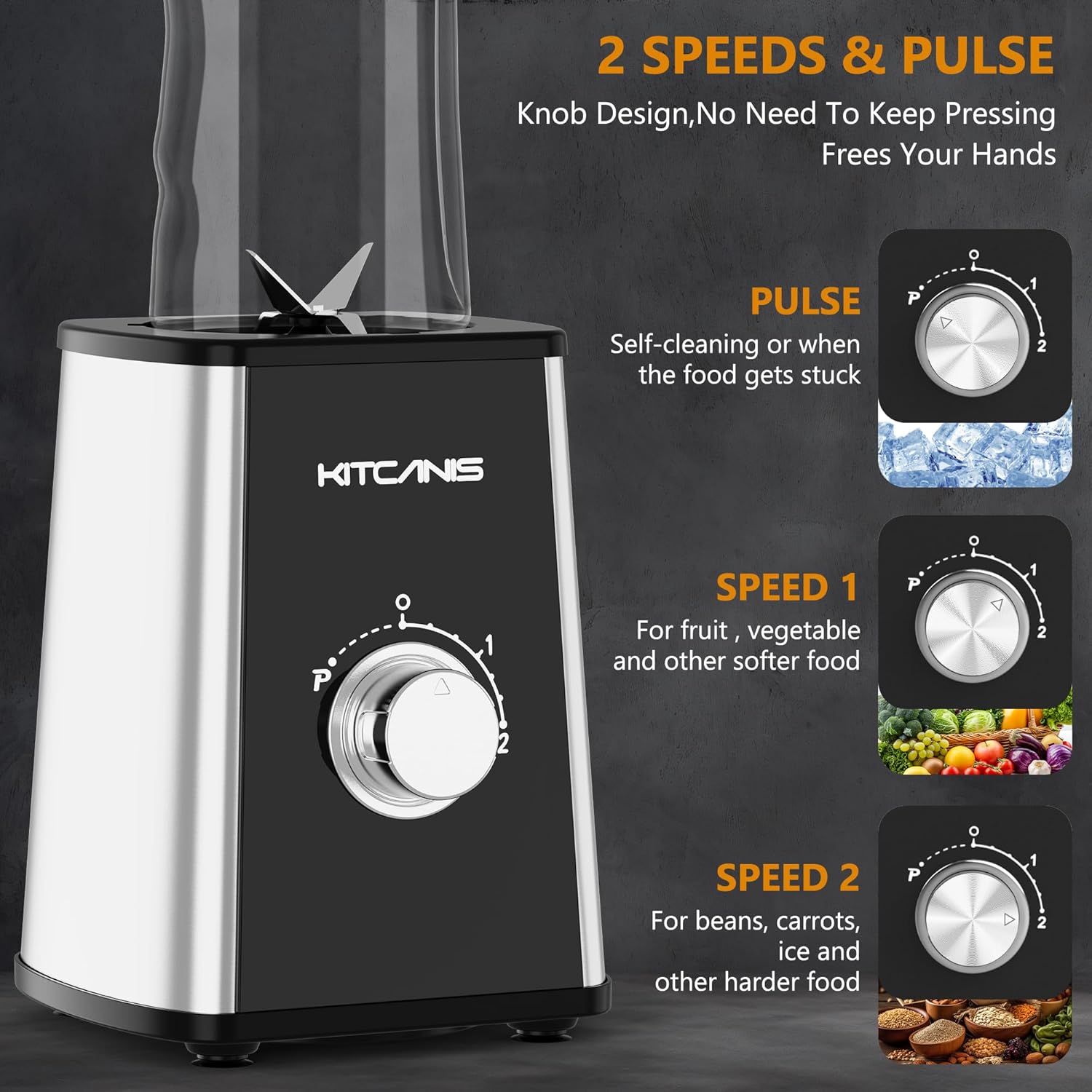• Висока мощност 800 W: блендерът Kitcanis има мощност от 800 W с до 35 000 оборота в минута. Смути мейкърът може да се използва за плодове, зеленчуци, ядки, кафе на зърна и дори кубчета лед, както и за всяка друга храна, която желаете. Само на 15 секунди сте от чаша прясно изцеден сок.
