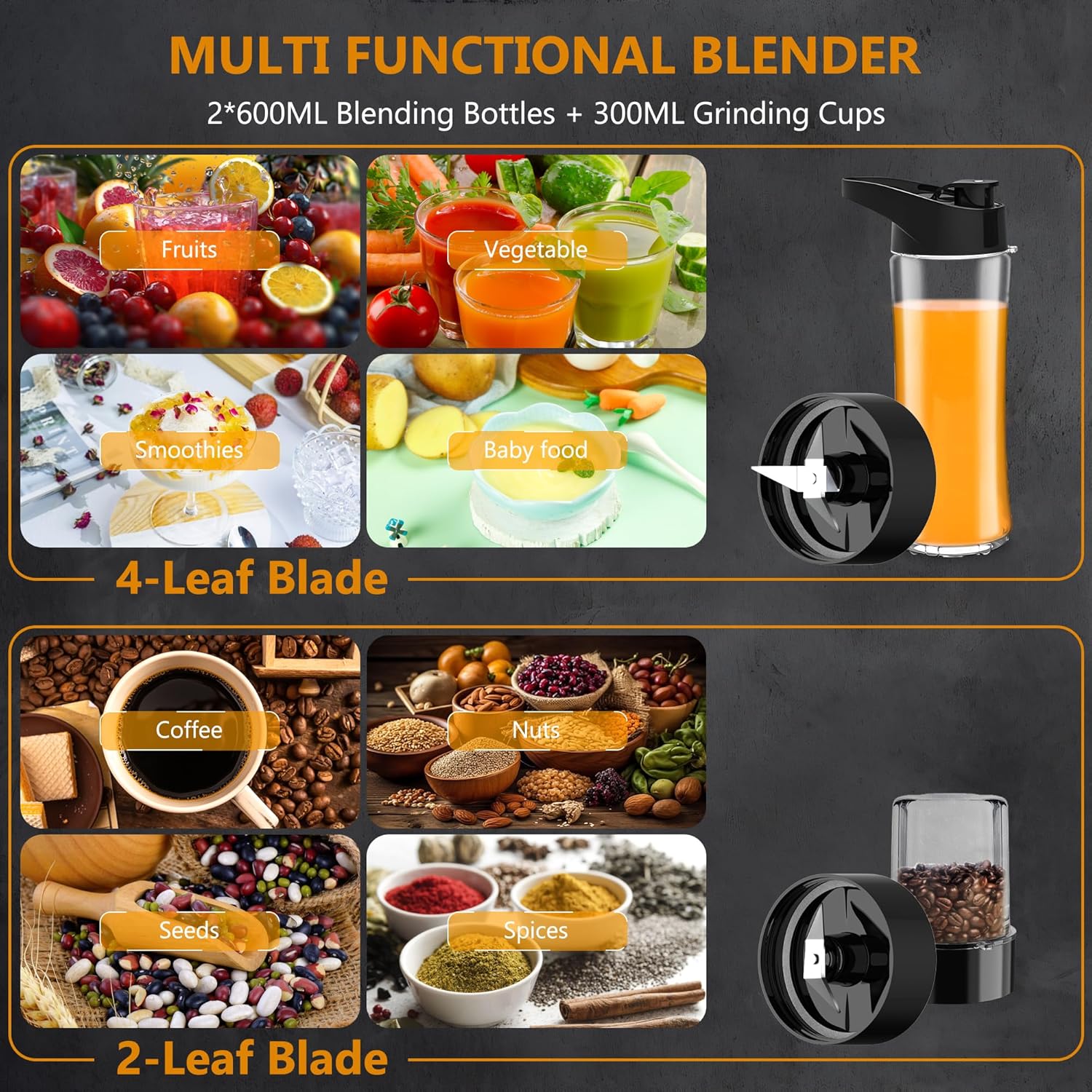 • 3-в-1 многофункционален: Повечето мини смутита на пазара могат само да смесват, но този миксер има функции както за смесване, така и за смилане. Предлагаме два комплекта ножове: нож с 4 ножа за сокове, млечни шейкове и смутита, нож с 2 ножа за смилане на кафе на зърна, ядки, подправки и др. Задоволете различните си нужди едновременно.