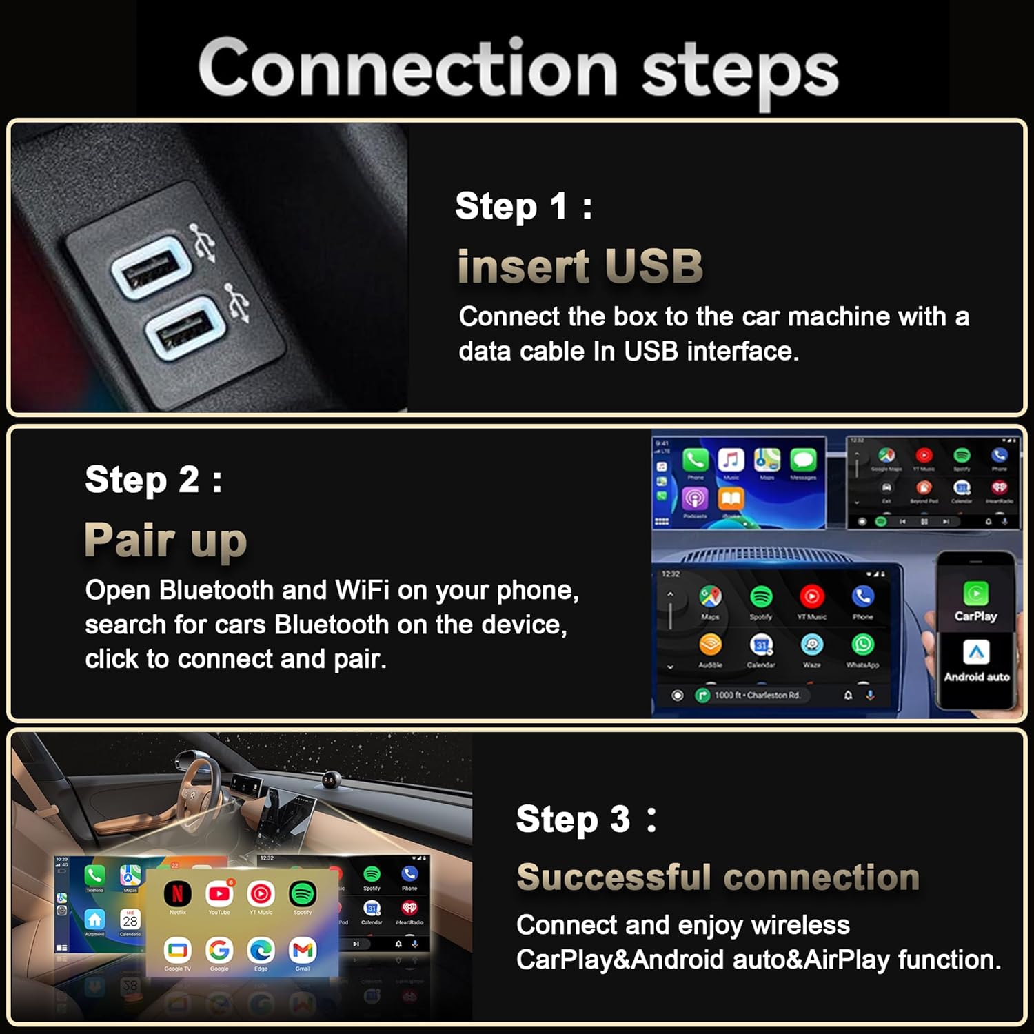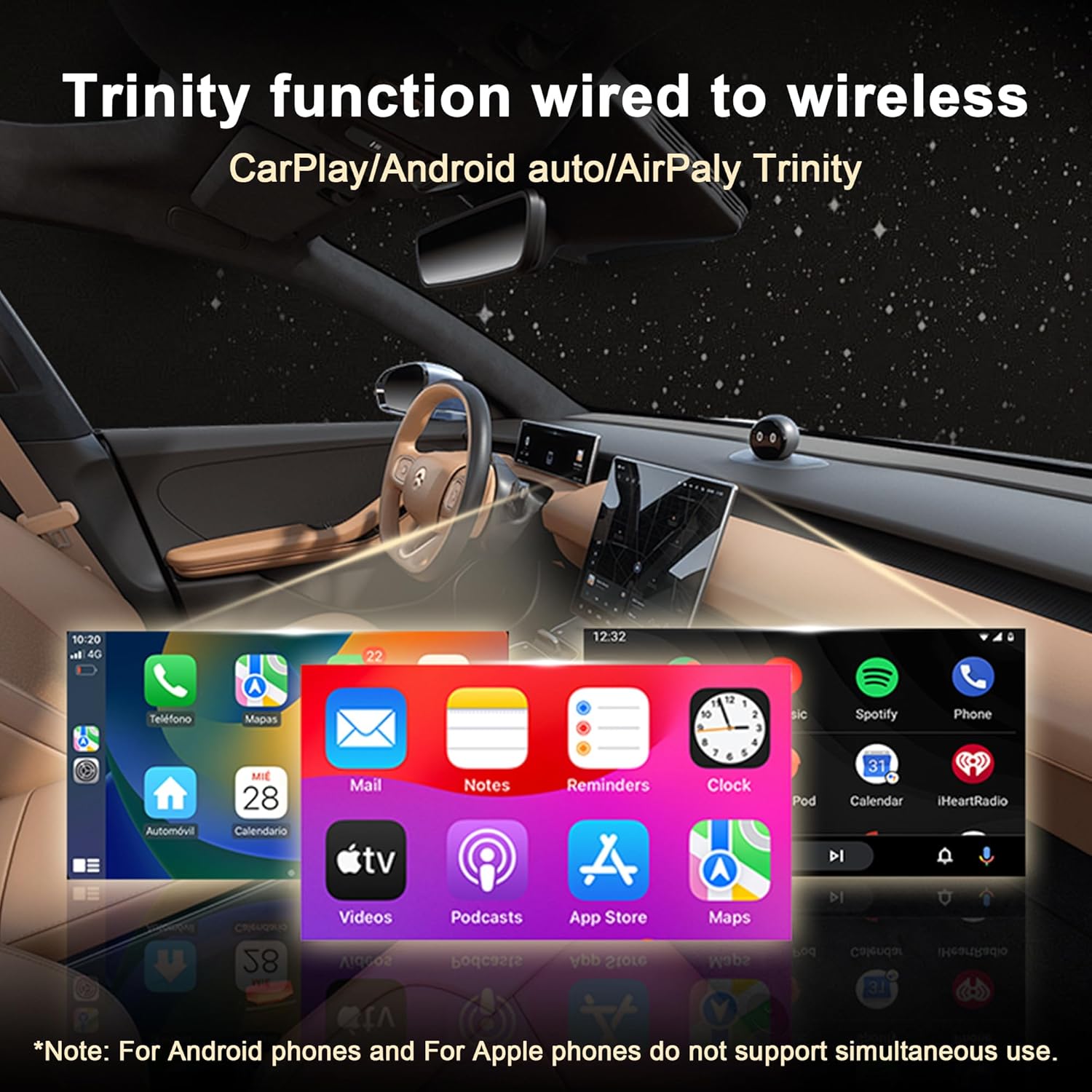 • 【Надграждане 3 в 1: Безжичен CarPlay + Mirror Link + Plug & Play】 Нашият най-нов модел комбинира безжичната технология CarPlay, Mirror Link и plug & play в едно компактно устройство. Изживейте безпроблемно безжично CarPlay и огледално показвайте дисплея на вашия iPhone на екрана на автомобила си, за да се наслаждавате директно на видеоклипове, навигация или музикални приложения.