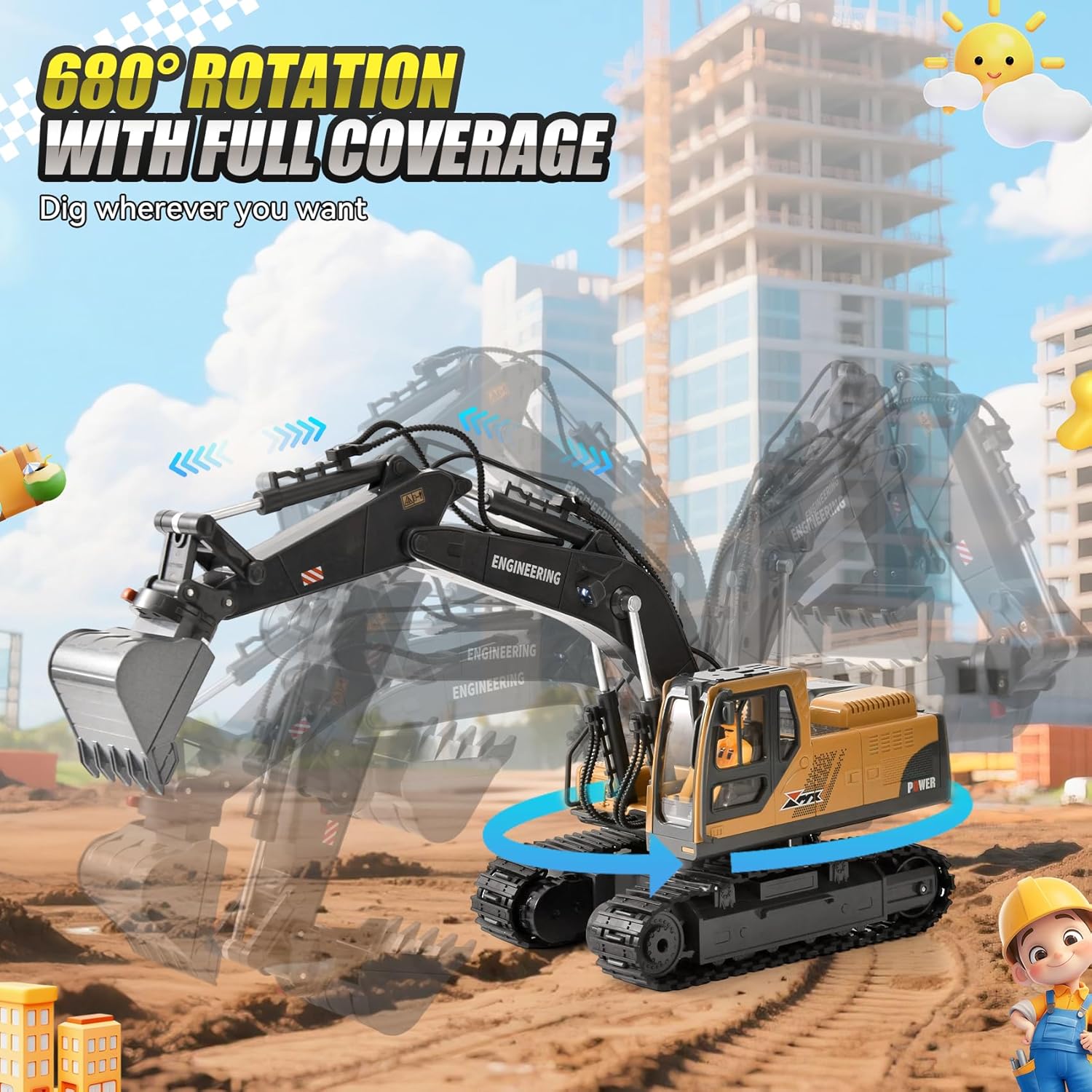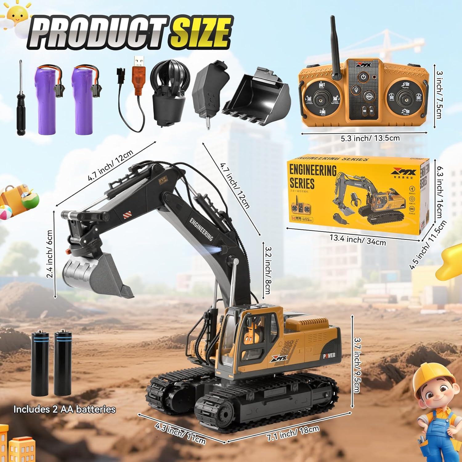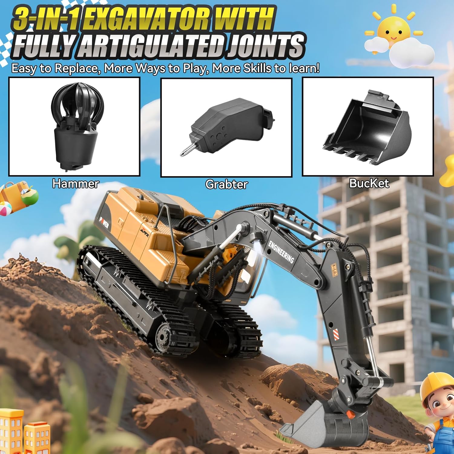 Този дистанционно управляван багер съчетава професионална технология с образователна стойност и е подходящ за деца на възраст от 3 до 12 години. Децата могат лесно да сменят три инструмента – лопата, грайфер и бормашина – за да изпълняват различни задачи на строителни площадки, в пясъчници или в градини. Прецизното дистанционно управление с честота 2,4 GHz има 14 канала за сложни операции, като завъртания на 680° и копаене в труден терен. Конфигурацията с двойна акумулаторна батерия осигурява надеждна работа дори при продължителна употреба.