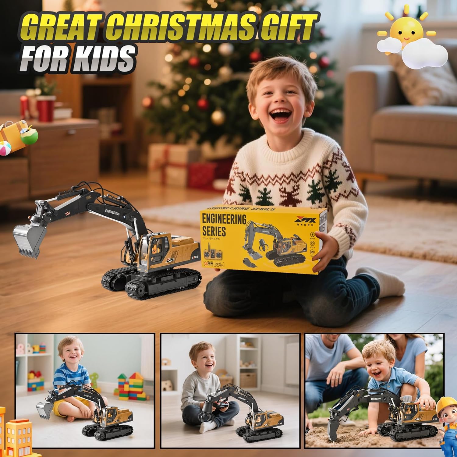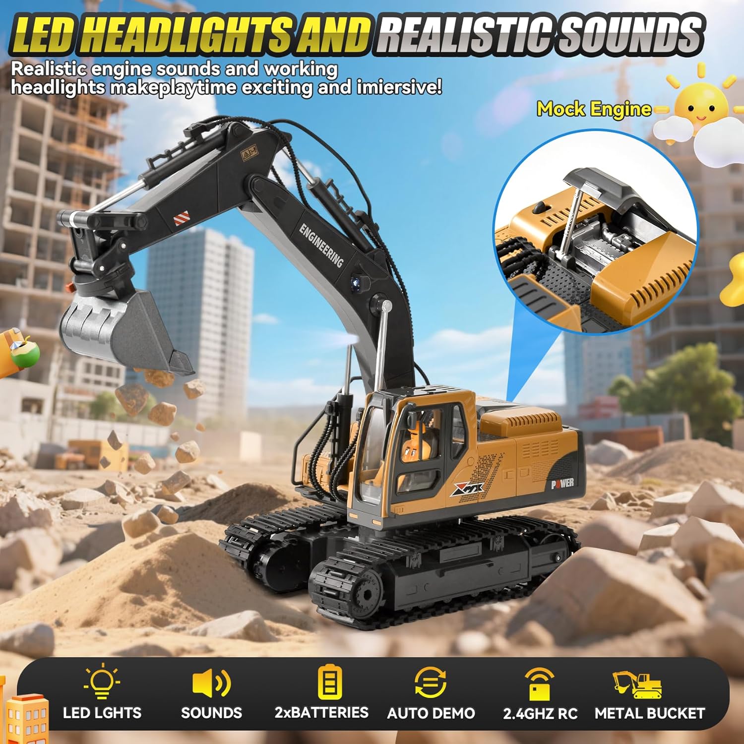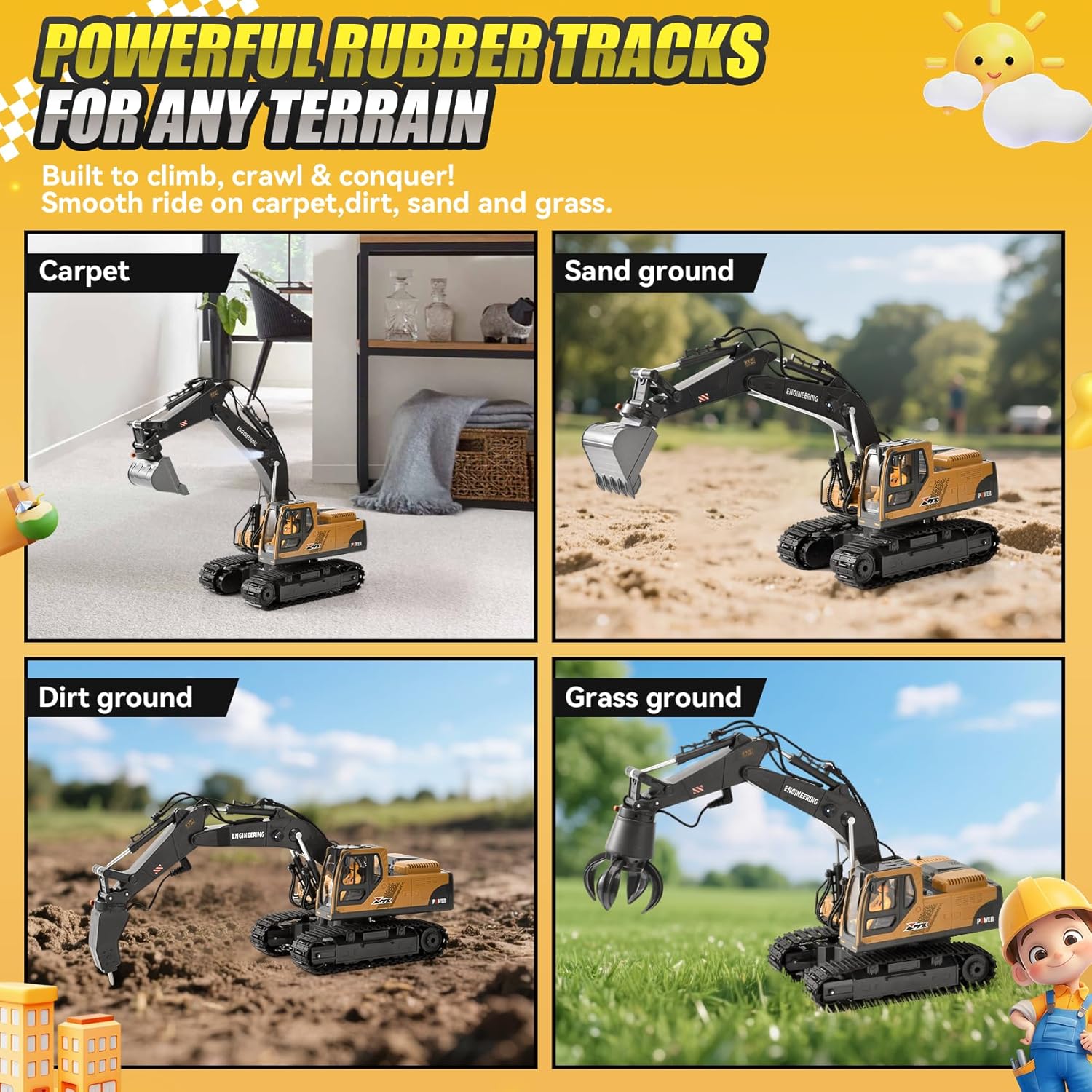 Този дистанционно управляван багер съчетава професионална технология с образователна стойност и е подходящ за деца на възраст от 3 до 12 години. Децата могат лесно да сменят три инструмента – лопата, грайфер и бормашина – за да изпълняват различни задачи на строителни площадки, в пясъчници или в градини. Прецизното дистанционно управление с честота 2,4 GHz има 14 канала за сложни операции, като завъртания на 680° и копаене в труден терен. Конфигурацията с двойна акумулаторна батерия осигурява надеждна работа дори при продължителна употреба.