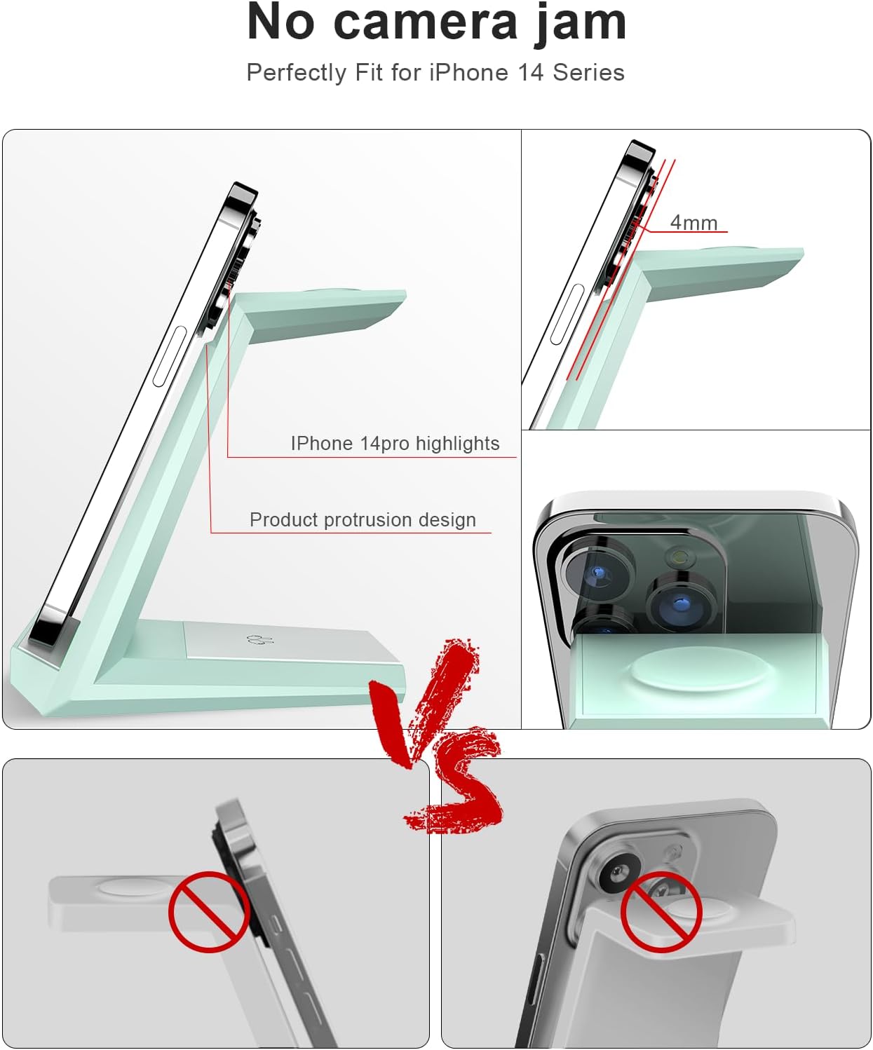 • Неплъзгащо се покритие за защита на устройствата и функция за магнитно зареждане за Apple Watch: 3-в-1 безжично зарядно устройство за зареждане с неплъзгащ се силиконов дизайн, който предотвратява движението или въртенето на безжичното зарядно устройство, за да се гарантира, че вашите устройства са защитени по време на зареждане. Специално проектирано магнитно зареждане за Apple Watch, часовникът не пада без причина.