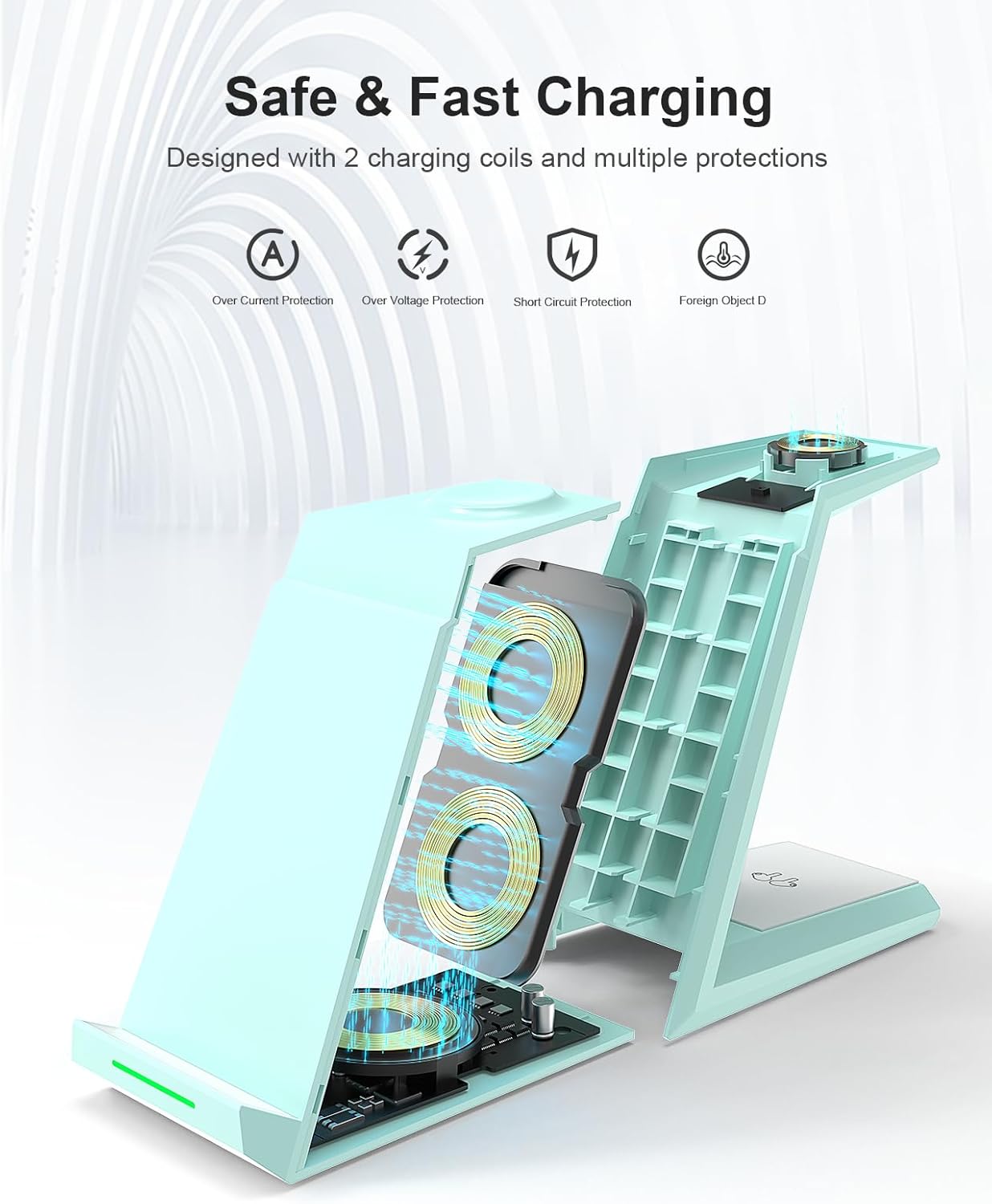 • 【Добър избор за потребители на Apple】1 безжична зарядна станция за 3 Apple устройства: iPhone и Apple Watch, AirPods. Съвместима с iPhone 17 16 16 Plus 16 Pro 16 Pro Max/15 15Pro 15Pro Max/iPhone 14 14Pro 14Pro Max 14 Mini/13 13Pro 13Pro Max 13 Mini/12 12Pro 12Pro Max 12Mini/11; Apple Watch 10/9/8/7/6/5/3/SE; AirPods Pro/3/2