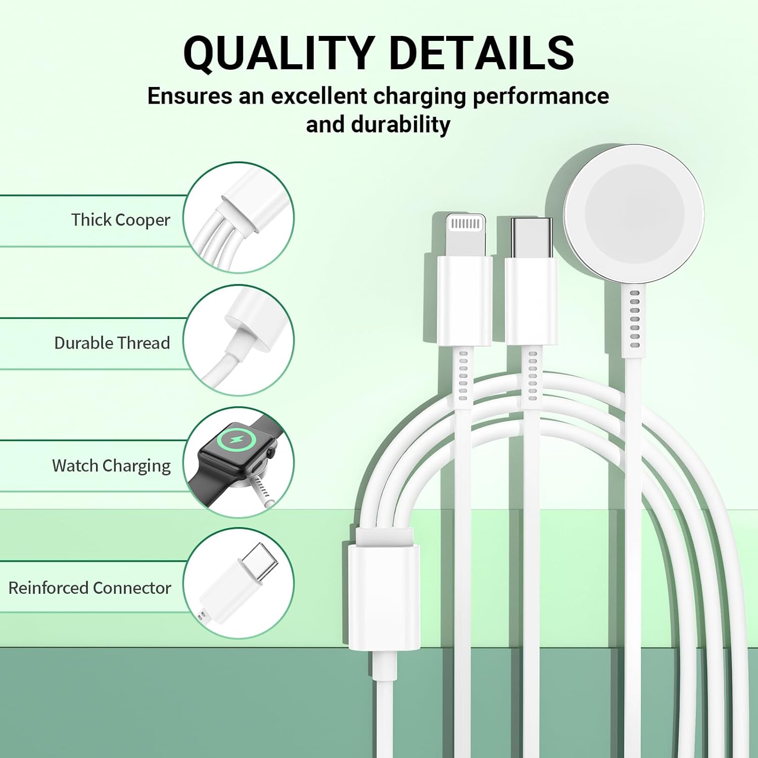 • 2 м кабел: 3-в-1 кабел за зареждане на iPhone и iWatch с оригинален MFI чип и вградена тел, изработен от висококачествен ABS+ PC и чиста медна тел, огъван е над 10 000 пъти, за да се избегне скъсяване на живота поради стареене и употреба. Дължината от 1,8 м, без заплитане, е удобна за употреба, докато зарядното устройство е у дома/офиса/при пътуване, в леглото, хотелските стаи и много други места.