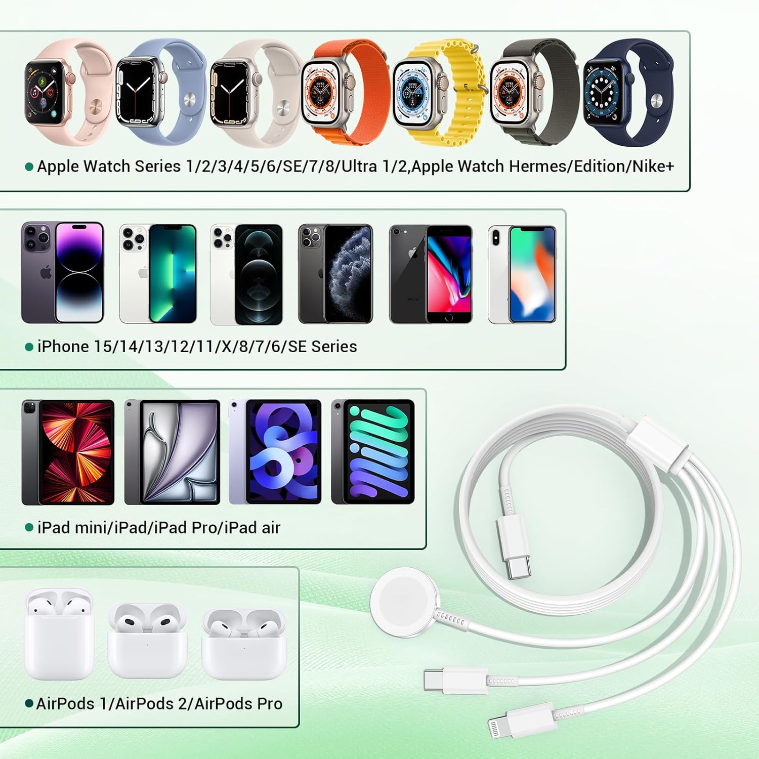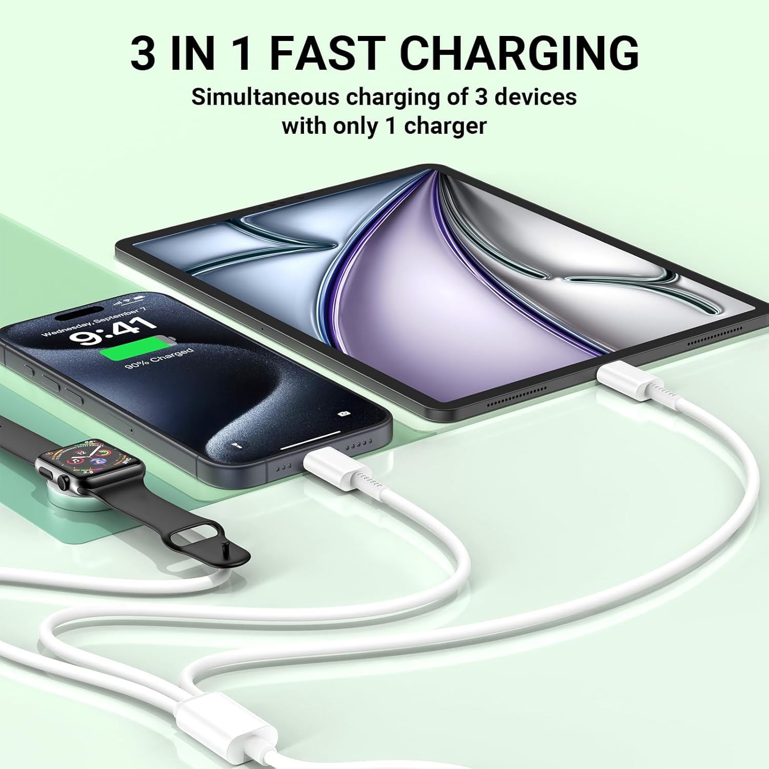 3-in-1 charging cable for Apple Watch and iPhone, 2M USB C iWatch charger with cable, iPhone fast charger charging adapter for Apple Watch Series 8/7/6/SE/5/4/3/Ultra/iPhone 15 Pro Max /14 Plus/13, iPad 3-in-1 charging design. The 3-in-1 watch charging cable of the latest version can be charged at the same time, which can be charged with mobile phones and watches, headphones and watches or iPad and iPad and Watches Compatible with The charging block is equipped with a USB-C quick transfer port, which is three times faster than 5W charging speed. SAFE CHARGING FOR DEVICES Our magnetic charging cable for Apple Watch is equipped with automatic chip detection, built-in magnetic charging module, and over current, over voltage and over temperature protection, providing a safe charging environment for your watch and charger. (Tips: Charging is not done by metal or case with a thickness of more than 4 mm, giving you a better experience. We hope you remove the iWatch case and use the adapter we offer.) 2M cable 3-in-1 iPhone and iWatch charging cable with the original and integrated MFI chip is made of high-quality ABS+PC and pure copper wire and has been bent tested over 10,000 times to avoid shortening the service life due to ageing and use. The tangle-free, extra long length of 6 feet is convenient for using this charger at home, in the office, when travelling in bed, in the hotel room and more. Super Compatibility This watch charger is not only compatible with Apple Watch series, but also with Apple Phones, including Apple Watch Series 8, Apple Watch Series 7 and Apple Watch Ultra. Supports standard charging speed for Apple Watch SE, Apple Watch Nike+, Apple Watch Hermes, Apple Watch Series 6/4/3/2/2/1. And iPhone 15/15 Plus/15 Pro/15 Pro Max/14/14 plus/14pro/14pro max/13/13pro/13pro max/12/12 Mini/12 Pro/12 Pro Max/SE/11/11 Pro/ 11 Pro max/xs and more devices.