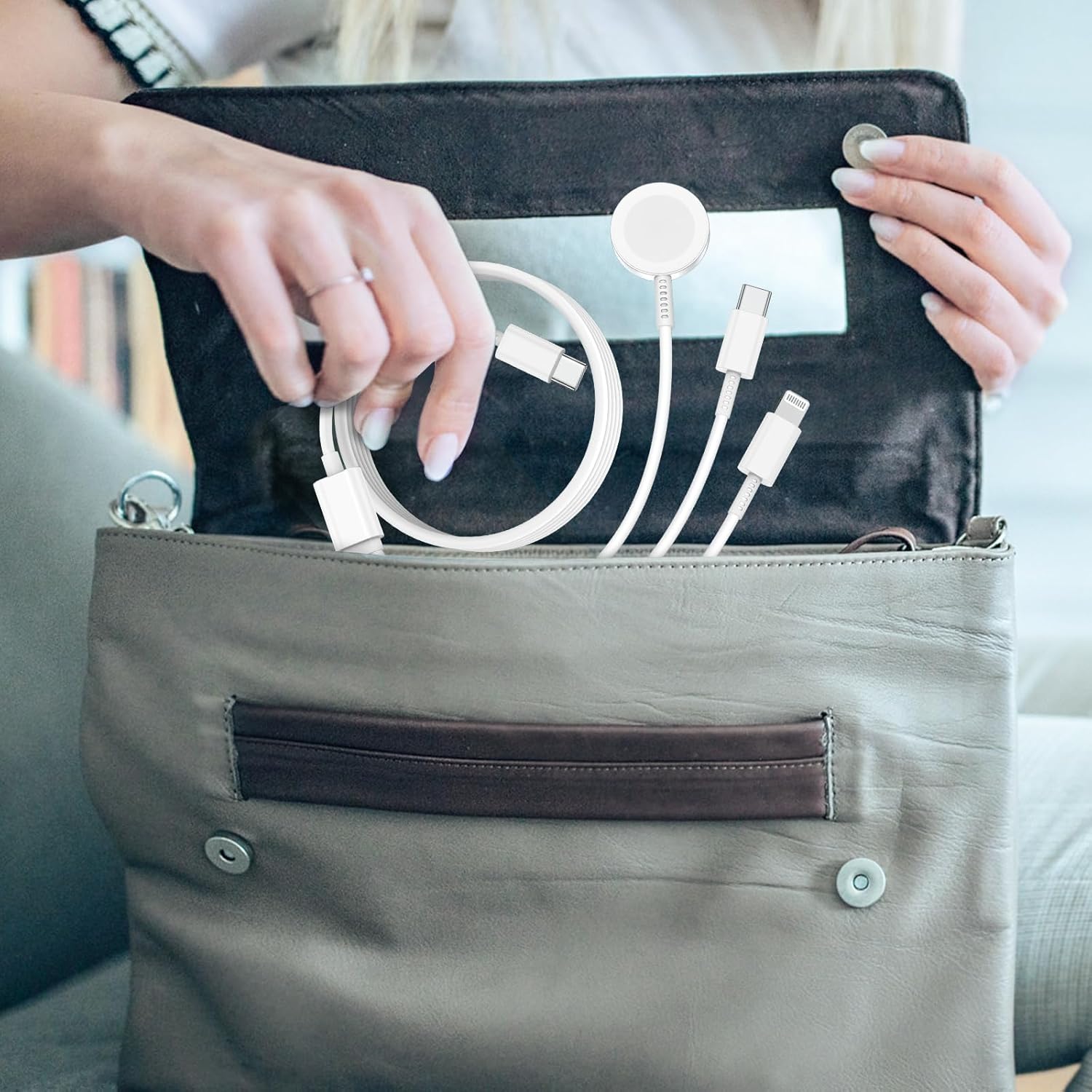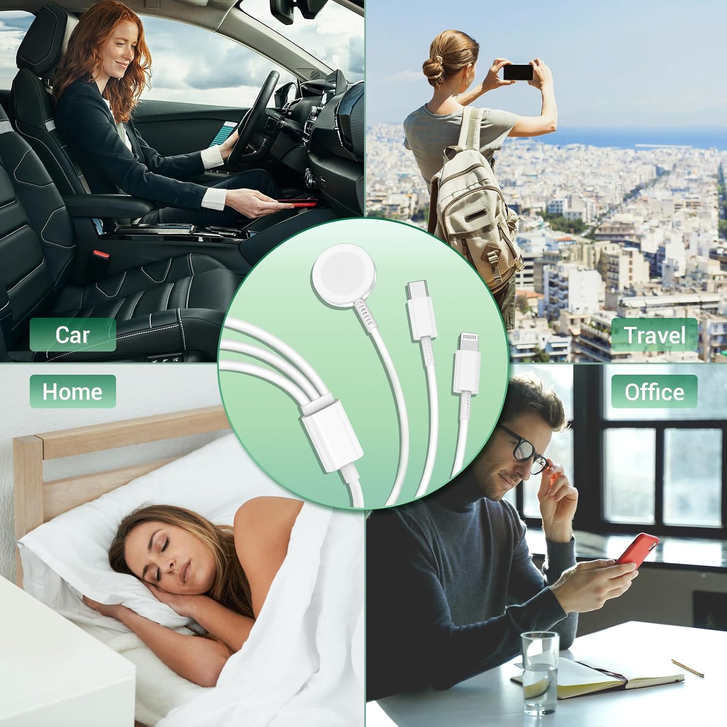 • Дизайн за зареждане 3 в 1: Кабелът за зареждане на часовник 3 в 1 може да зарежда едновременно, като е съвместим с мобилни телефони и часовници, слушалки и часовници или iPad и часовници. Зарядният блок е оборудван с USB C порт за бързо прехвърляне, който е 3 пъти по-бърз от 5W скоростта на зареждане.