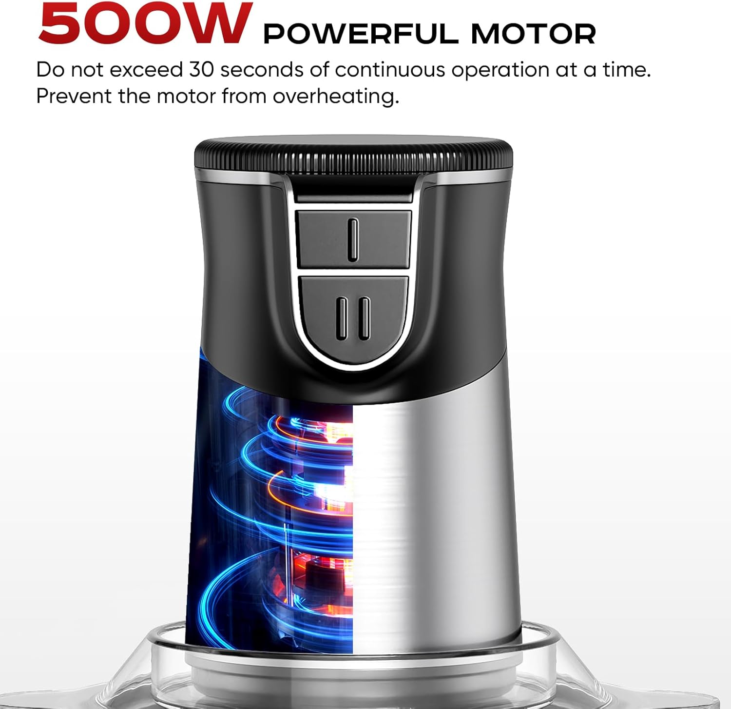 • 【Високопроизводителен мотор с мощност 500 вата + три перфектно координирани контейнера】: високопроизводителният мотор и трите контейнера образуват перфектен екип: чопърът за месо, контейнерът от 600 мл за кремообразни смутита и ледени шейкове, контейнерът от 100 мл за подправки или кафе на зърна. Всичко това с мощността на мотора с мощност 500 вата.
