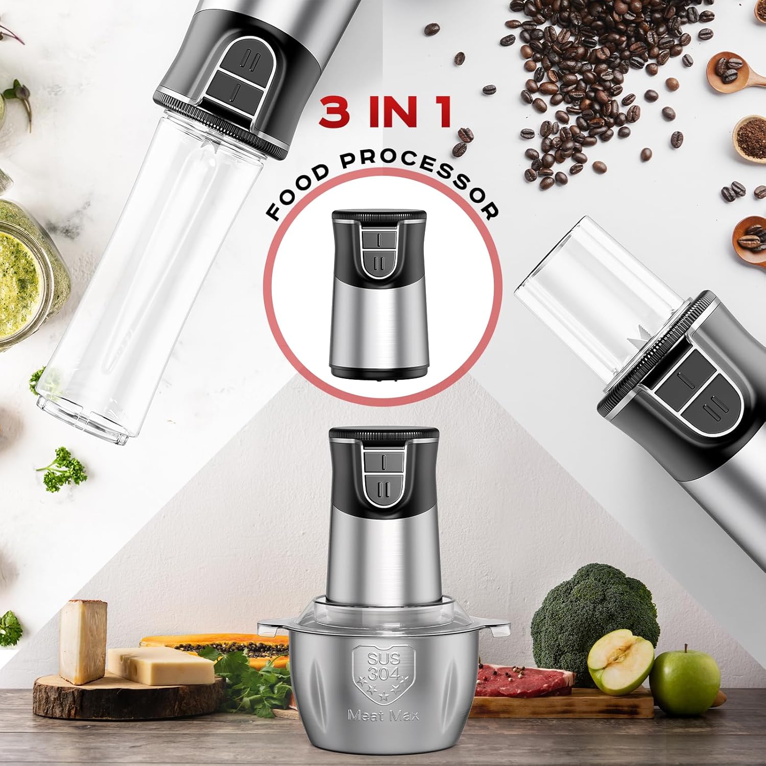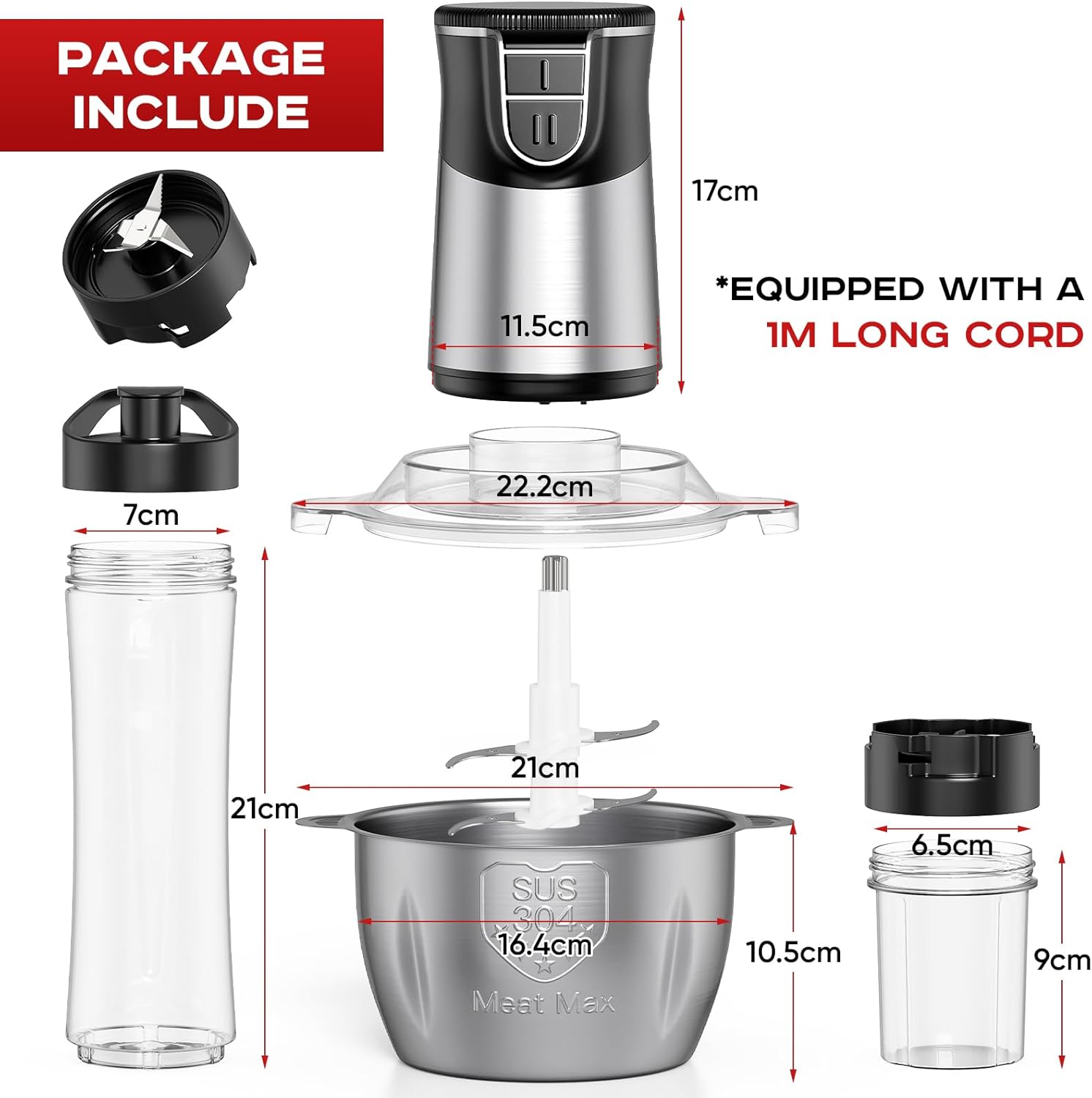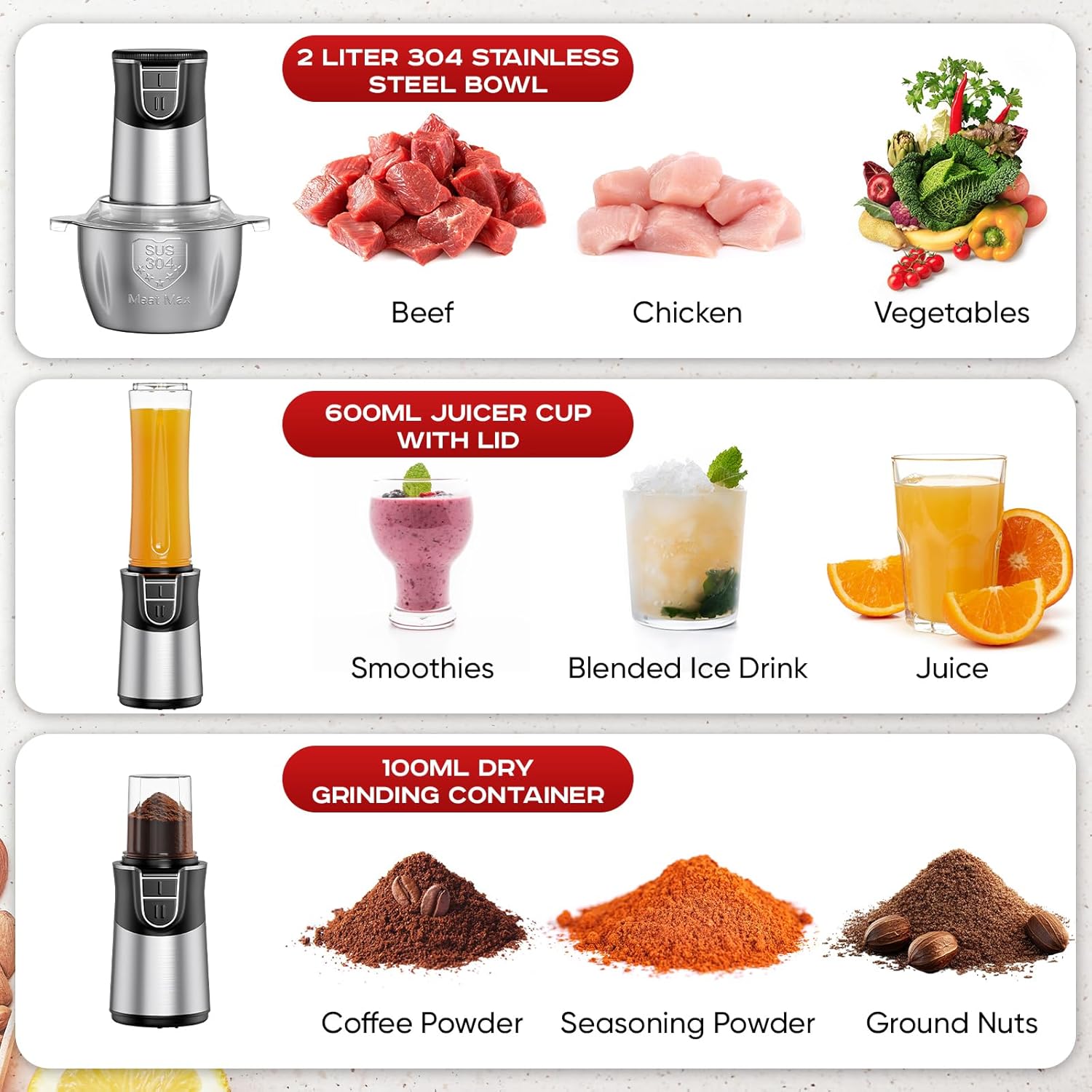 • Многофункционален мини миксер 3 в 1: Многофункционалният миксер 3 в 1 съчетава функциите на миксер, машина за смутита, чопър и електрическа мелничка за подправки в едно устройство. Оборудван е с мощен 500-ватов мотор и три перфектно съчетани контейнера: 2-литров контейнер от неръждаема стомана за месо, 600 мл контейнер за сок за смутита и шейкове и 100 мл контейнер за смилане на подправки и кафе на зърна. Така спестявате място и сте готови за употреба.