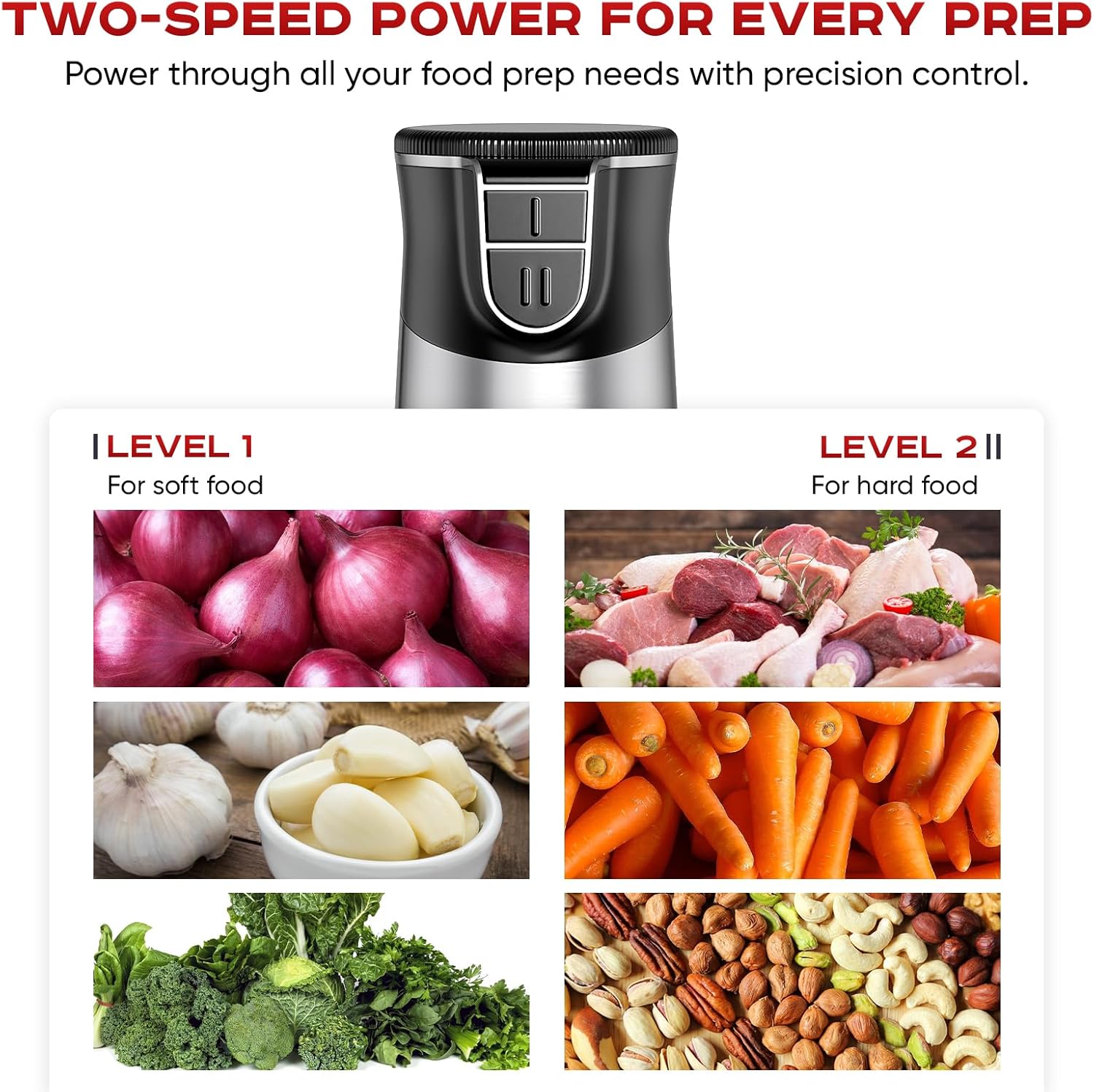 • Две скорости - нежна или силна, винаги най-добри резултати: изберете между две скорости за оптимални резултати: ниво I за меки храни като плодове, чесън или лук. Етап II за твърди съставки като месо, моркови, ядки или бобови растения. Така винаги постигате най-добрата консистенция бързо и ефикасно.