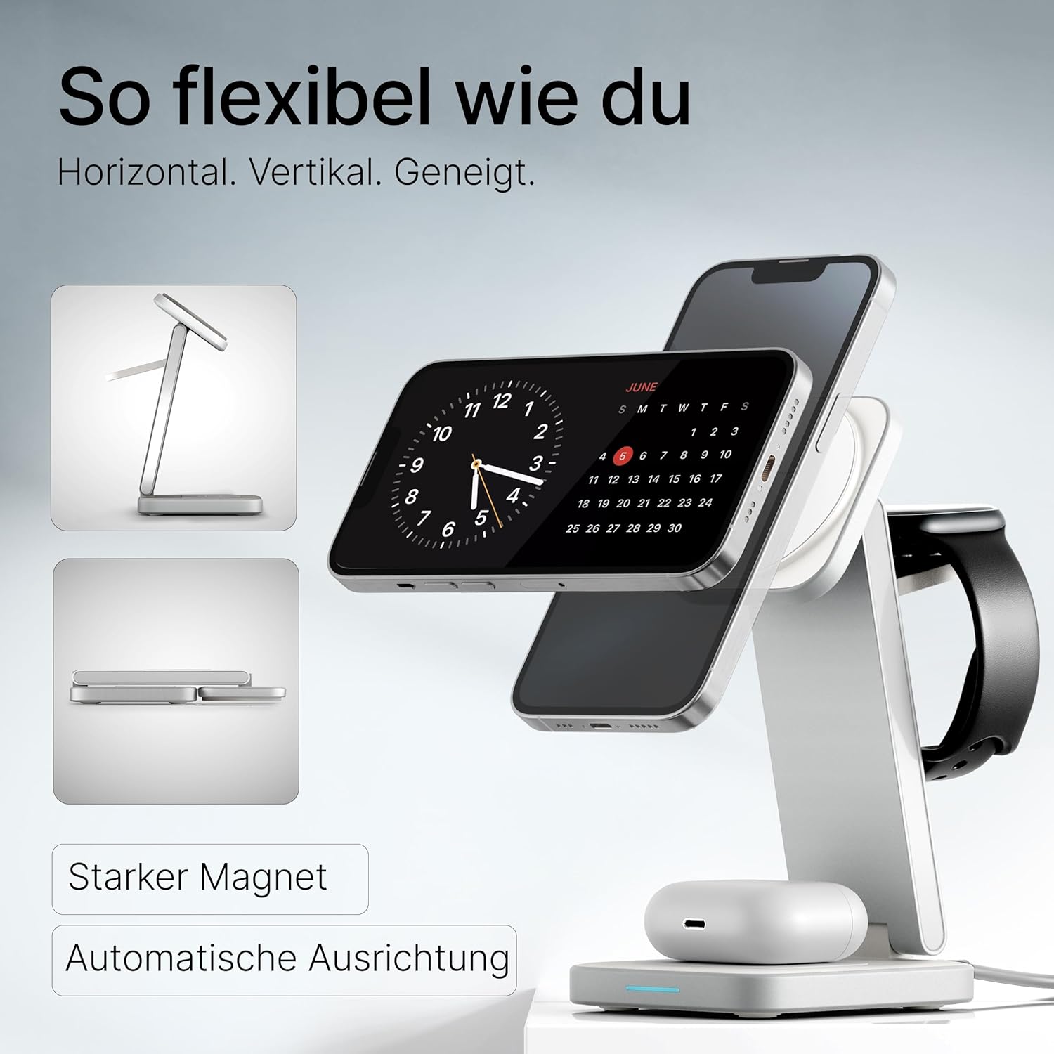 • УДОБНА ЗА ПЪТУВАНЕ: Компактна и сгъваема, идеална за пътуване. Зарядната станция се побира във всеки джоб и е подходяща като безжично зарядно устройство, MagSafe зарядно устройство, безжично зарядно устройство или индуктивна зарядна станция за iPhone.
