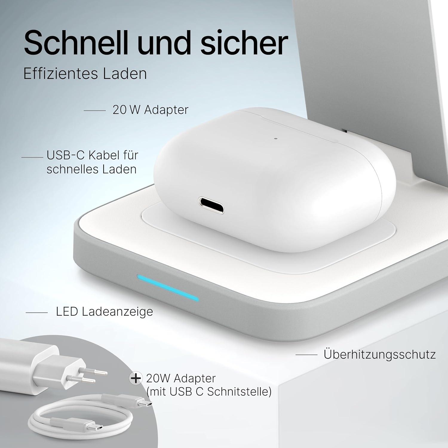 3 в 1 MagSafe зарядно - Висококачествен алуминий - Безжично зарядно за iPhone, Apple Watch и AirPods, Сгъваема зарядна станция за Apple Watch и iPhone, с 20W адаптер и USB-C кабел