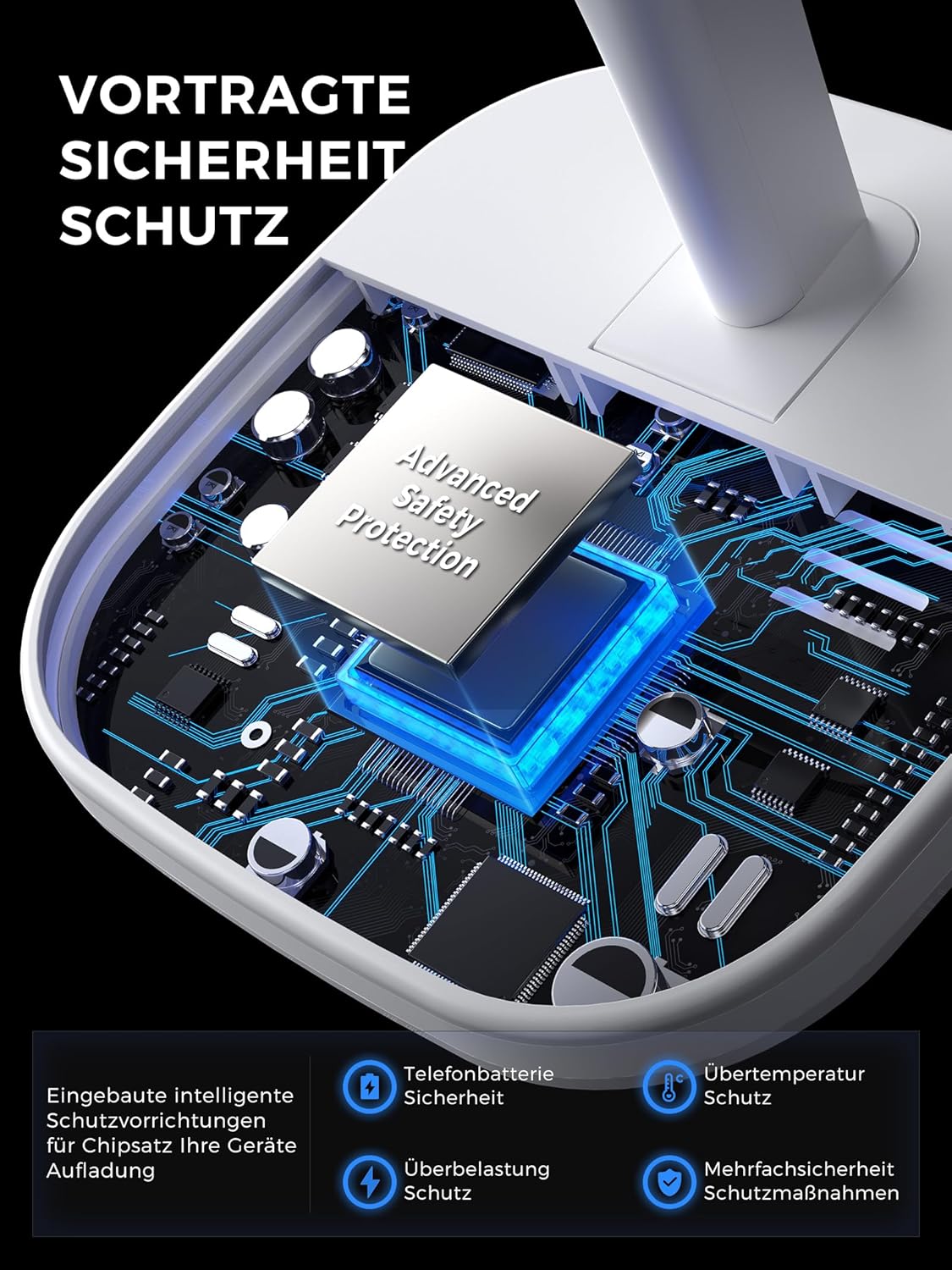 • Множество интелигентни функции за защита: нашата индуктивна зарядна станция осигурява безопасен и надежден процес на зареждане. Тя е оборудвана с интелигентна технология за защита, която включва множество функции за безопасност: защита от пренапрежение и свръхток за защита на батерията, контрол на температурата за охлаждане на устройството и защита от късо съединение за допълнителна безопасност. Благодарение на многото отвори за охлаждане на гърба, устройството се охлажда ефективно по време на зареждане.