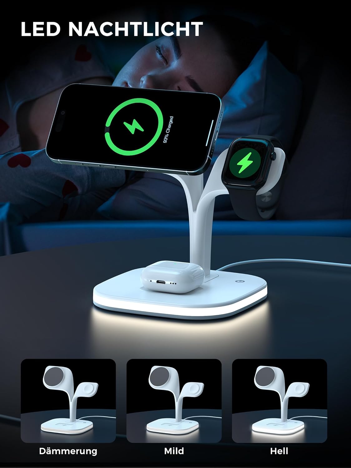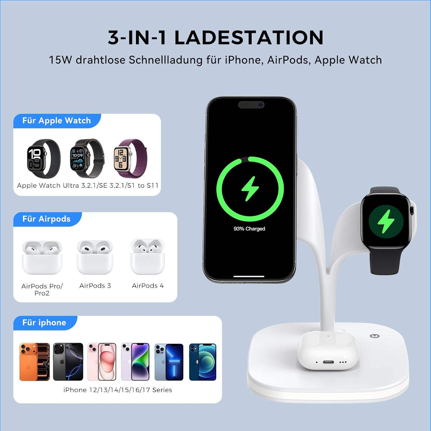 • 3-в-1 зарядна станция за Apple Watch и iPhone: Тази бърза магнитна зарядна станция може да зарежда вашия iPhone, Apple Watch и AirPods едновременно. Необходими са само около 1,5 до 2 часа, за да заредите напълно iPhone 17 и Apple Watch S11 (други марки се нуждаят от до 3,5 часа за това). Зарядното устройство MagSafe е съвместимо с всички iPhone 12-17, Apple Watch Series 2-11/SE/Ultra, AirPods Pro/Pro 2 и AirPods 2/3/4 ANC.