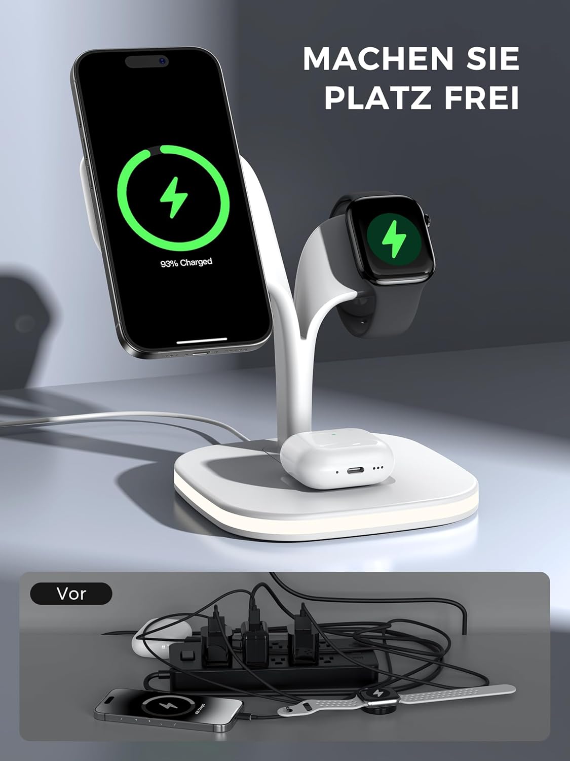 • Какво получавате: 1 x 3-в-1 магнитна безжична зарядна станция, 1 x 20 W PD захранване, 1 x USB-C към C кабел (1 метър), 1 x ръководство за потребителя (английският език не е гарантиран). Нашата 3-в-1 зарядна станция за множество устройства е и перфектен подарък за семейството и приятелите. Съвместима е с iPhone, Apple Watch и AirPods.