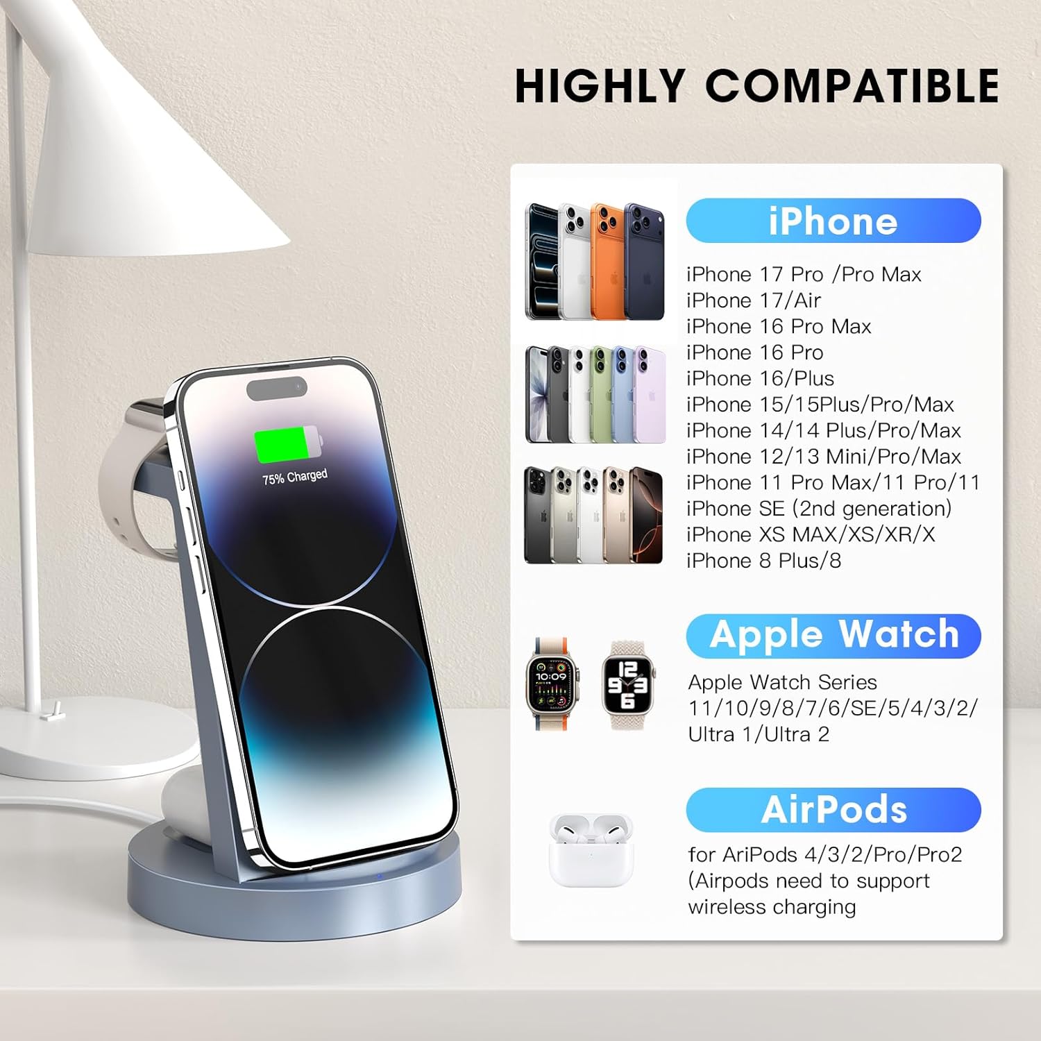 • Висока съвместимост: перфектно безжично зарядно за Apple, съвместимо с iPhone 17/17 Pro/Air/17 Pro Max/16e/16/16 Plus/16Pro/16 Pro max/15/15 Plus/15Pro/15 Pro max/14/14 Plus/14Pro/14 Pro max/13/13Pro/13Pro Max/13 mini/13.2/12Pro/12Pro Max/12 mini/11/11Pro/11Pro Max/XS/XR/XS MAX/X/8/8Plus & Apple iWatch 11/10/9/8/7/6/5/4/3/2/SE/SE 3/Ultra 1/2 3 & AirPods Pro2/Pro/4/3/2 (Забележка: Airpods поддържат само калъф за зареждане Mag-Safe)