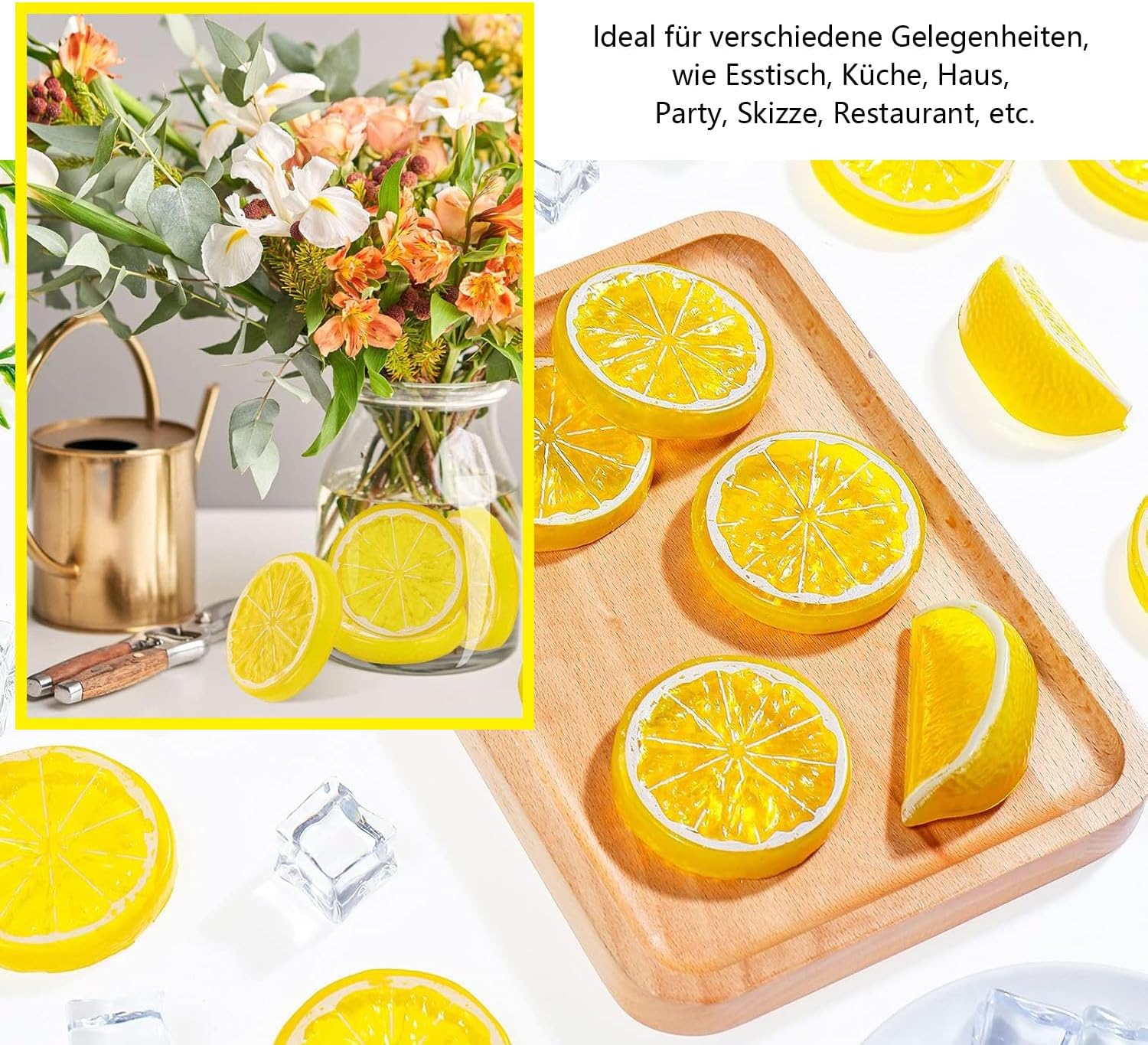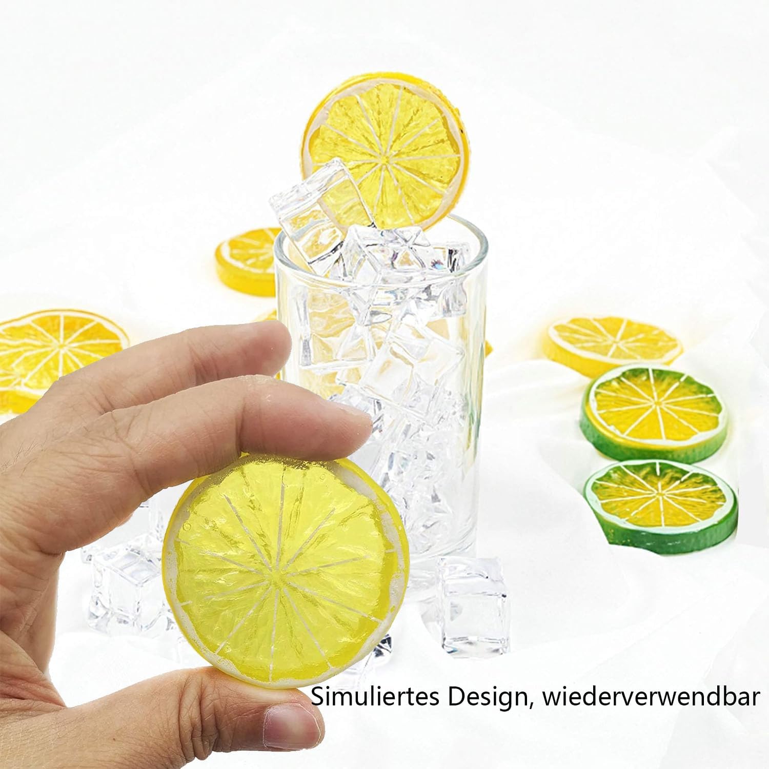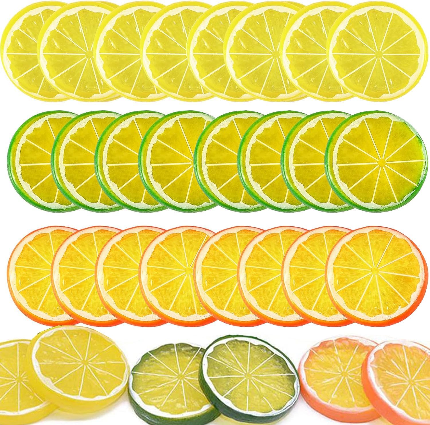 • РАЗЛИЧНИ ЦВЕТОВЕ Тези пластмасови изкуствени резенчета лимон се предлагат в различни цветове и добавят оживен щрих към всяка обстановка, като дом, ресторант, кетъринг и други. Могат да издържат дълго време, не гният, устойчиви на цветове, издръжливи са и са за многократна употреба, просто избършете с влажна кърпа.