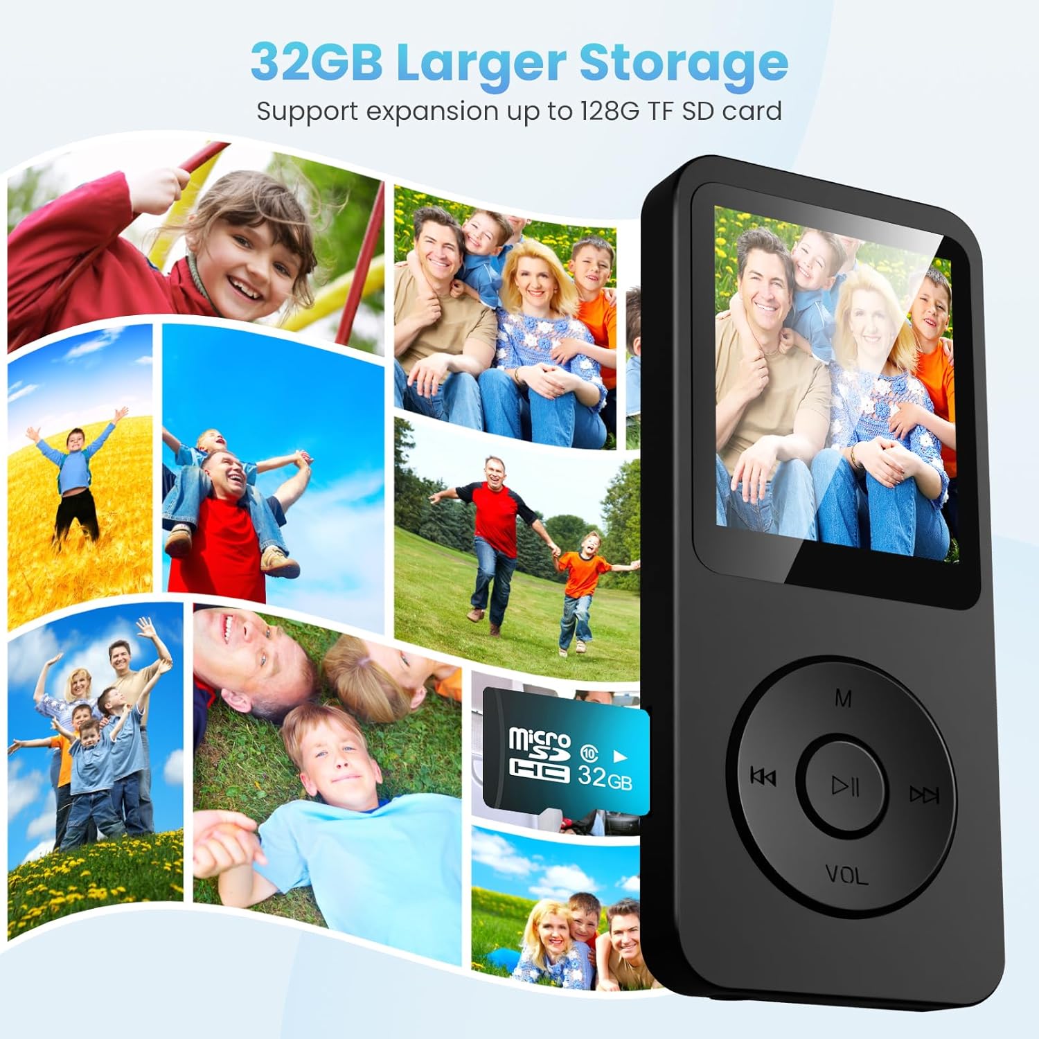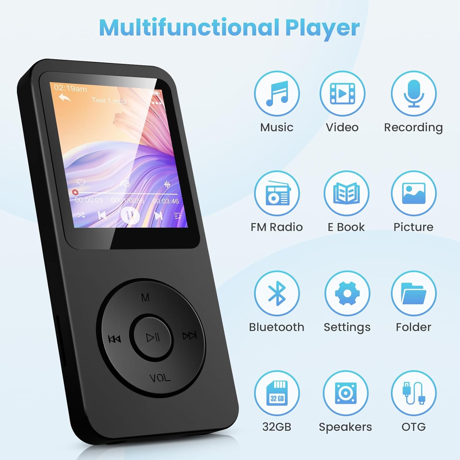 32GB MP3 плейър - Bluetooth 5.3 с 1.8-инчов TFT цветен екран със слушалки, HiFi музикален детски MP3 плейър с високоговорител, FM радио, запис на електронни книги, поддръжка до 128 GB