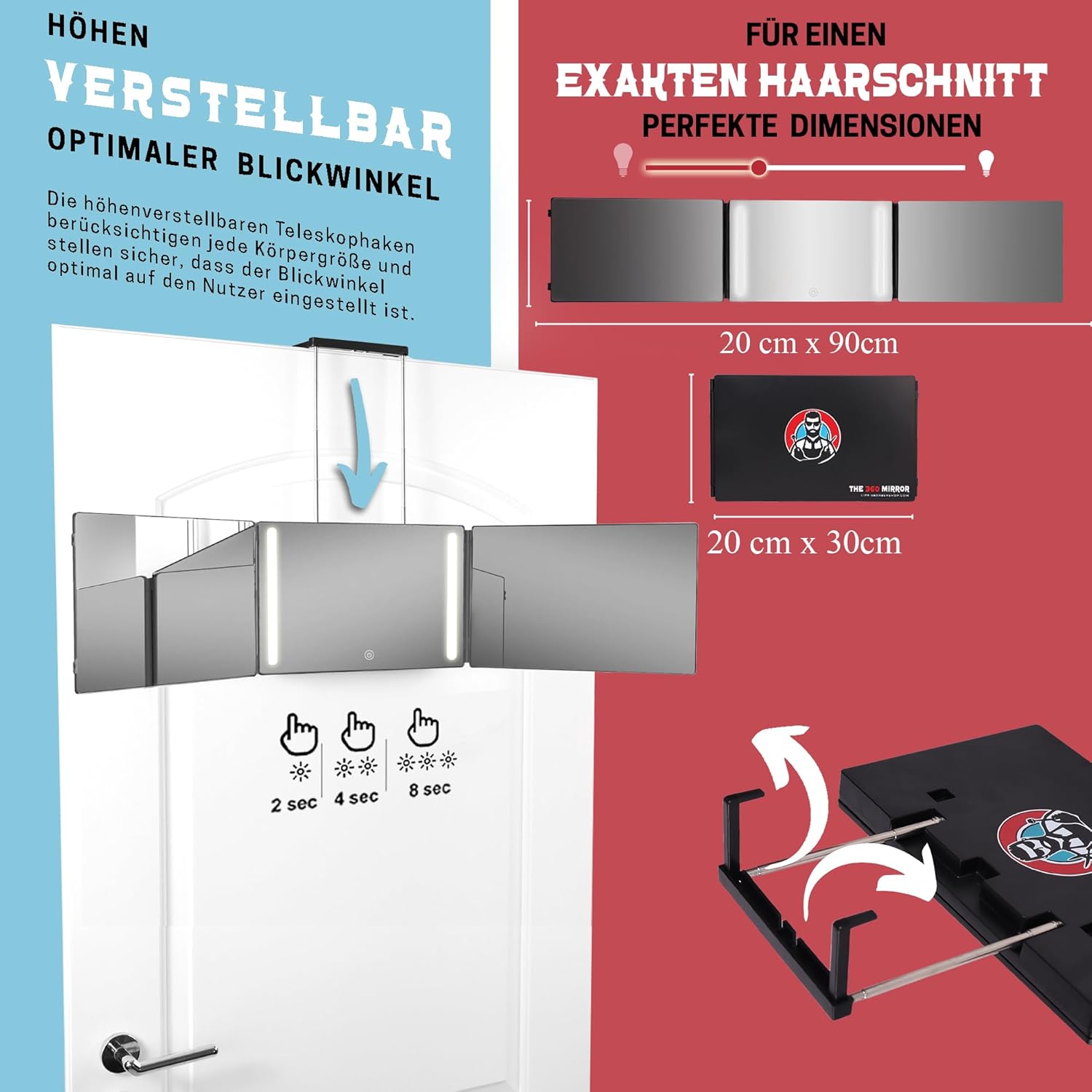 360-градусово LED огледало - вариант за пътуване с регулируеми телескопични куки, перфектно огледало за самостоятелно подстригване за мъже - тройно огледало за подстригване - огледало за подстригване на косата