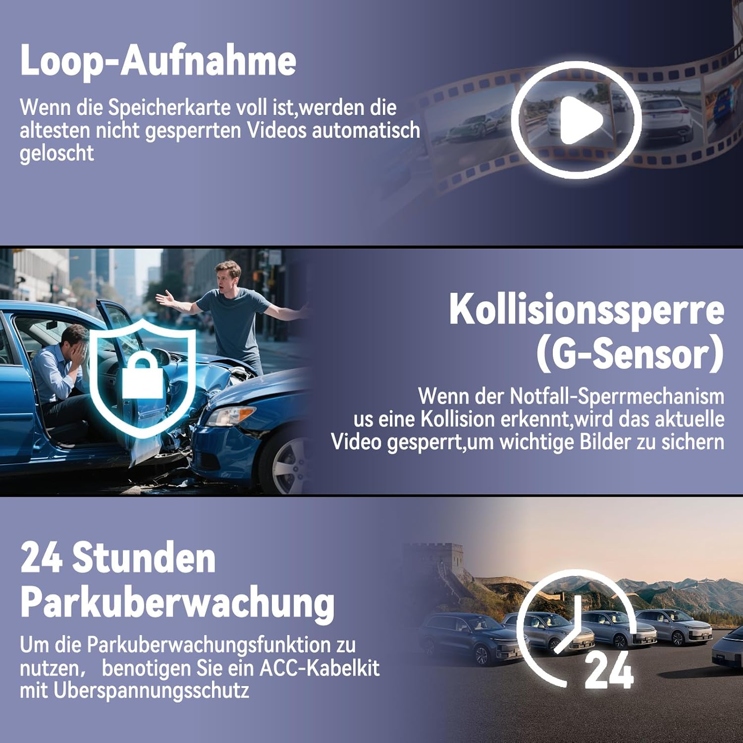 • 【Integriertes WLAN/APP-Steuerung】 Die Autokameras verbindet sich über integriertes 2.4G Hz WLAN mit der App, ohne dass eine Datenübertragung erforderlich ist. Auto Kamera 360 Grad überwachung Über die Smartphone-App können Sie Bilder in Echtzeit anzeigen, wiedergeben sowie Ihre aufgenommenen Videos herunterladen und verwalten. Mit nur einem Klick können Sie Ihre Reisen und schönen Momente mit Freunden und Familie teilen.Unsere dashcam auto vorne hinten sind die ideale Wahl für Taxi-/Fahrdienstvermittlungsplattformen, Transportfahrzeuge, gewerbliche Fuhrparkfahrer und Privatanwender