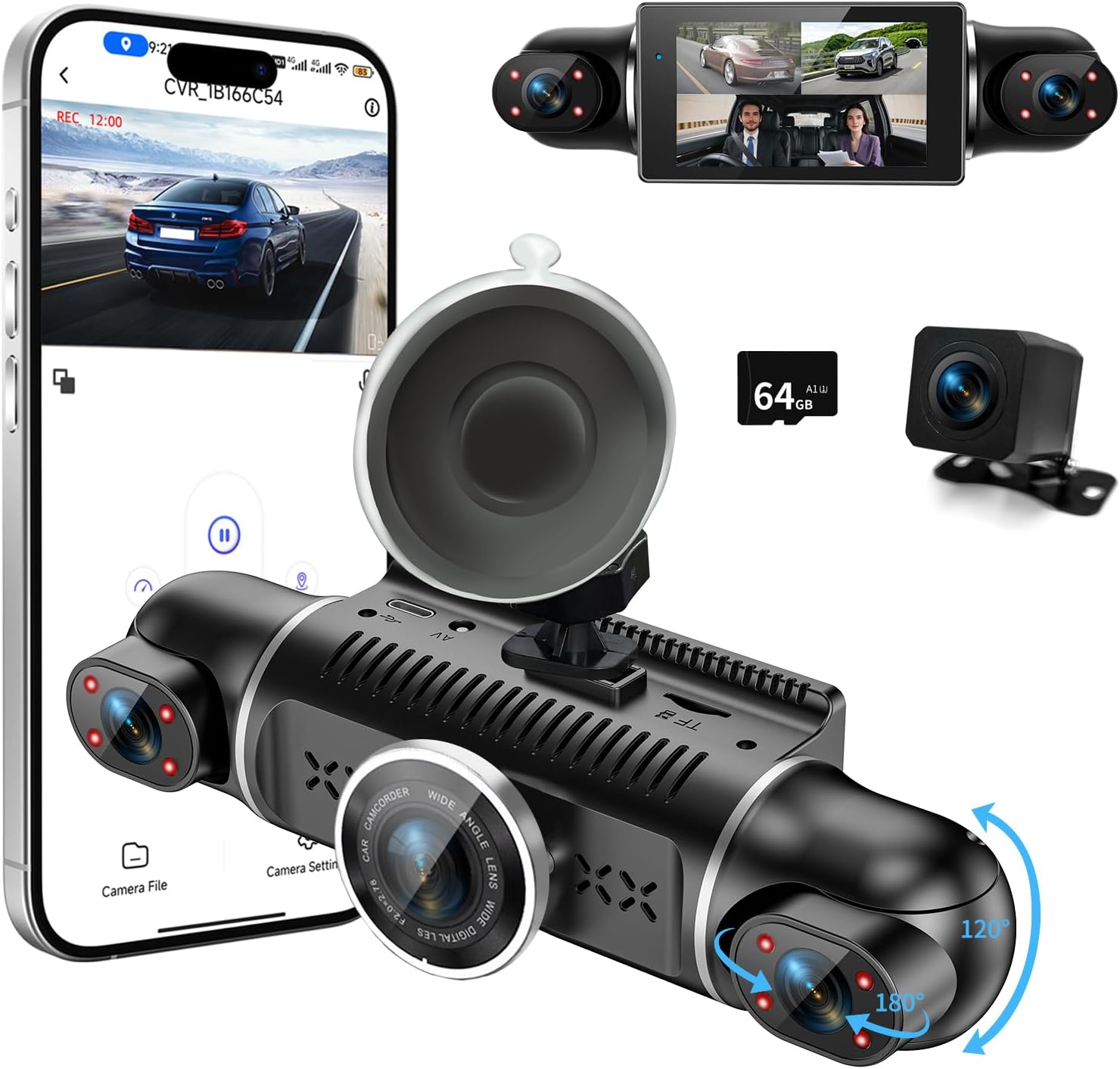 • 【4-канална 360° панорамна видеорегистратор】Първата в света 4-канална видеорегистратор за кола разполага с четири 140° широкоъгълни камери (отпред/отзад/лява/дясна) с 4K+1080P HD запис. Тя обхваща всички ъгли около автомобила и ефективно намалява мъртвите зони. Страничните камери могат да се завъртат на 180° хоризонтално и 120° вертикално: Завъртането на 180° напълно заснема страничните ленти и надеждно документира смяната на лентата или сблъсъците. Накланянето на 120° позволява наблюдение на интериора – независимо дали става въпрос за безопасност на детски столчета или ценности, всичко е винаги на видно място. Това гарантира, че винаги шофирате безопасно и безгрижно.