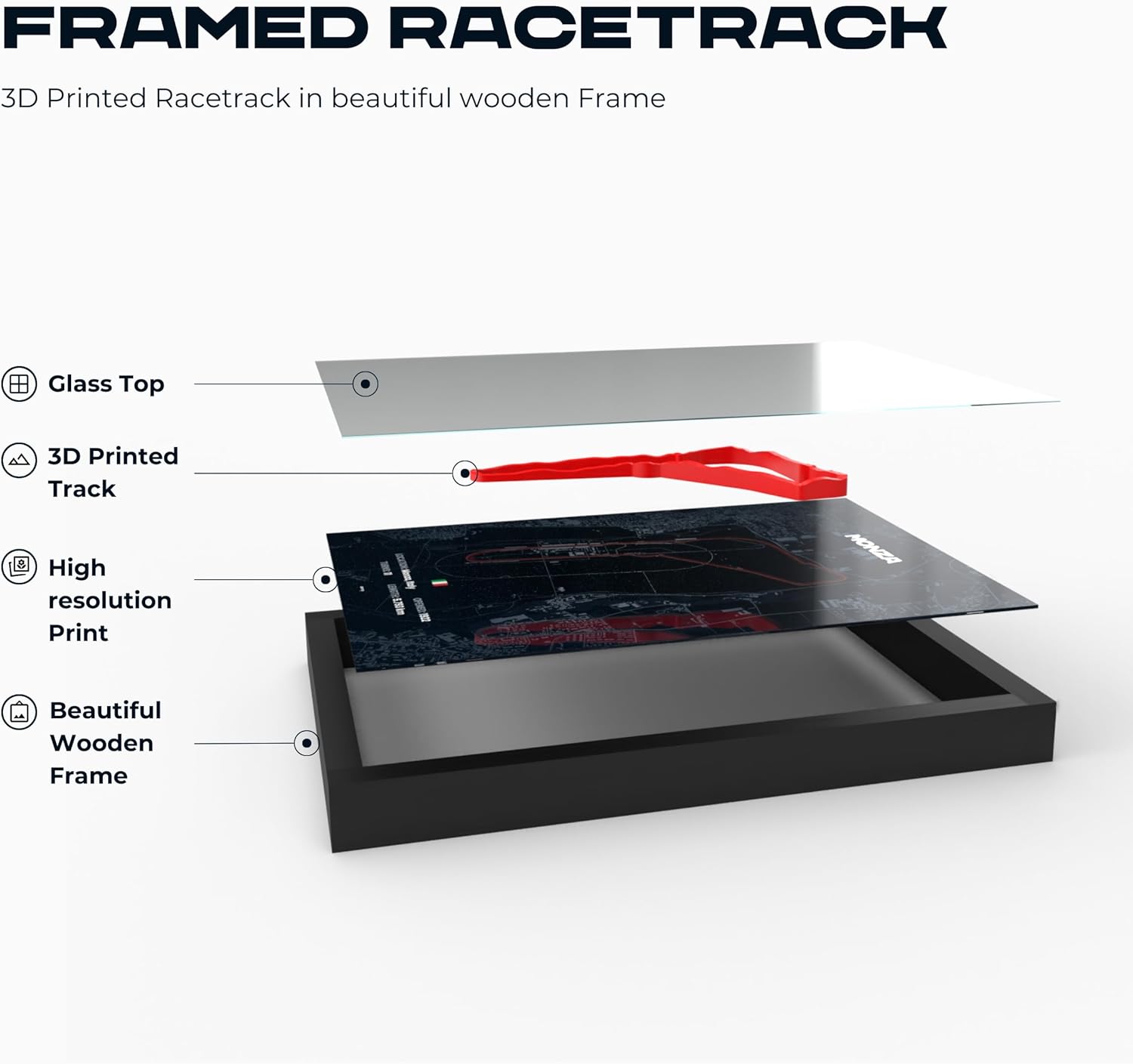 Изживейте състезателните писти в ново измерение. Благодарение на технологията за 3D печат, контурът на пистата стърчи от плаката и създава визуален ефект.