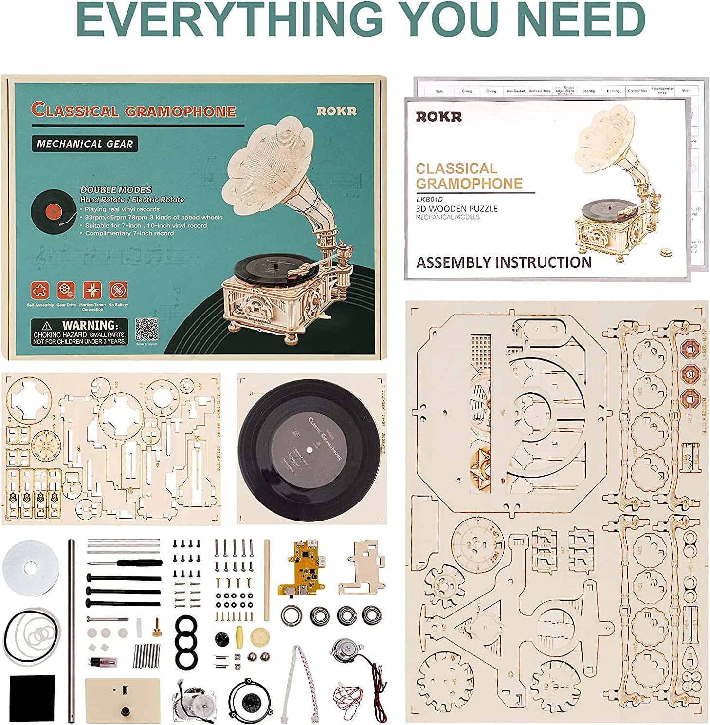 3D пъзел ROKR, Класически грамофон, 420 части, 22.1 x 22.6 x 42.9 см, За деца над 14 години