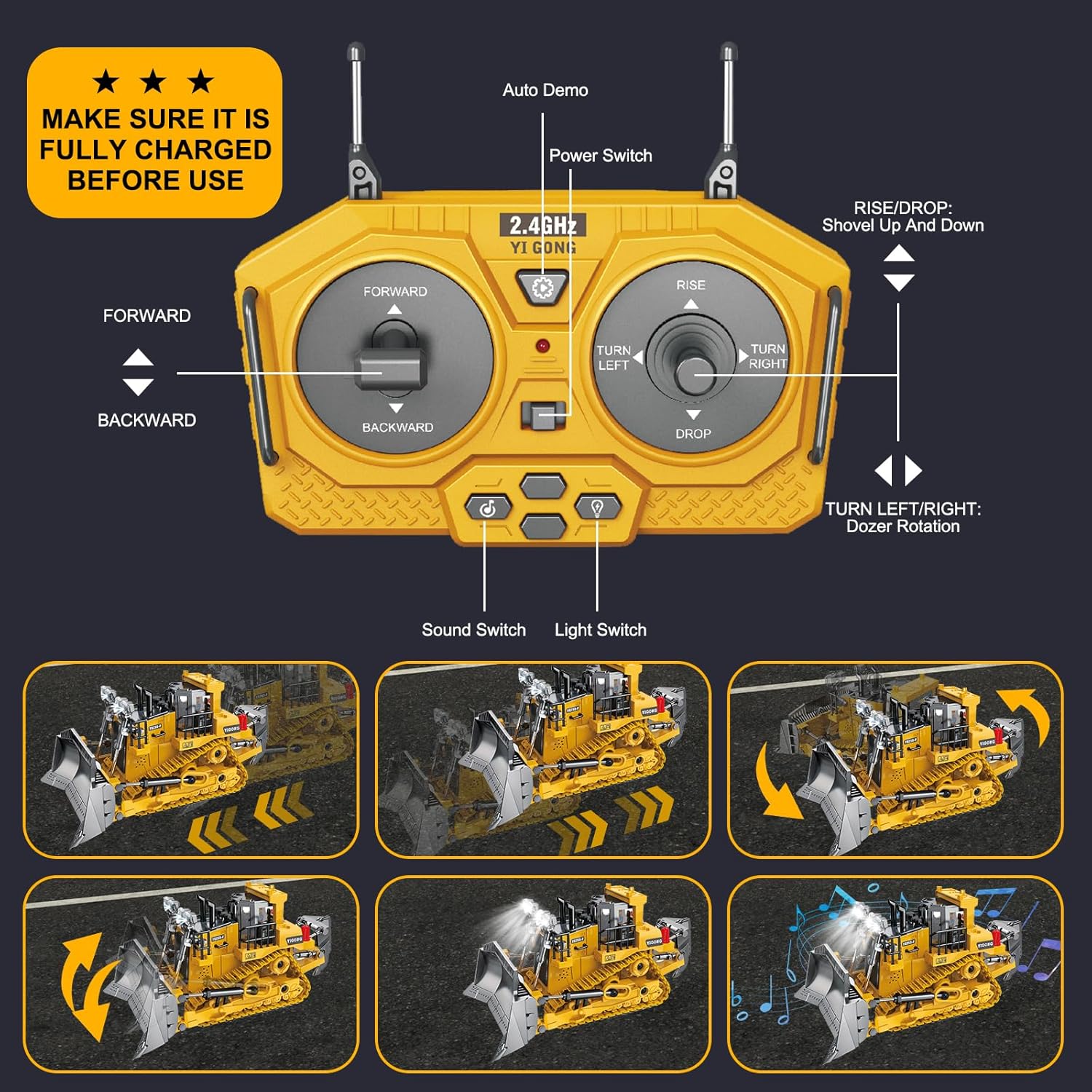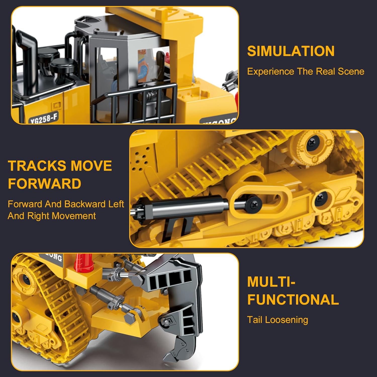 • Многофункционален: Този булдозер с дистанционно управление е оборудван с 9-канална система за управление, която позволява движение напред, назад, надясно и наляво, движение нагоре/надолу, въртене на 360°, демонстрация с едно докосване, реалистична музика и симулирано осветление, осигуряващи гъвкава работа.