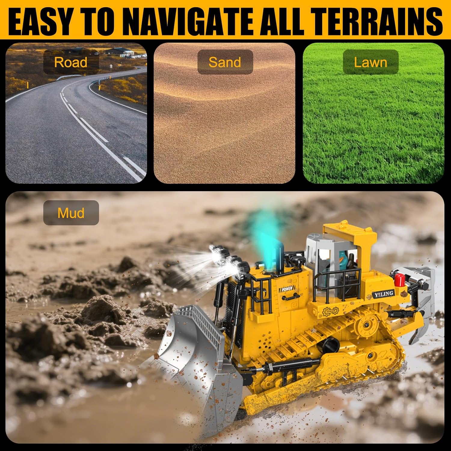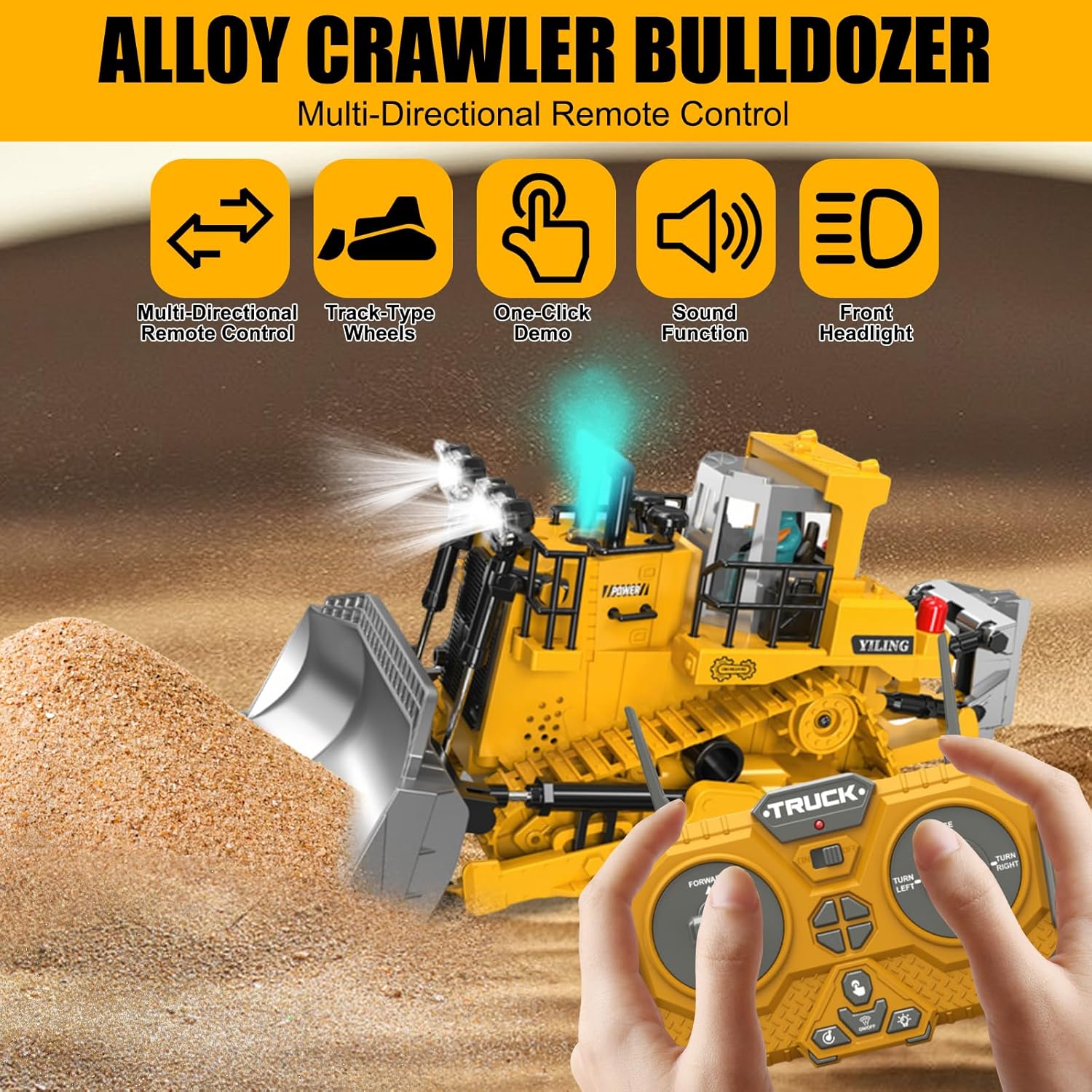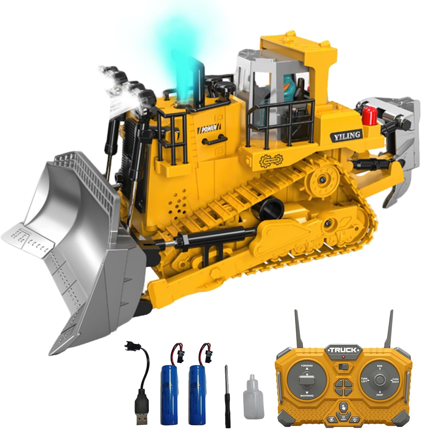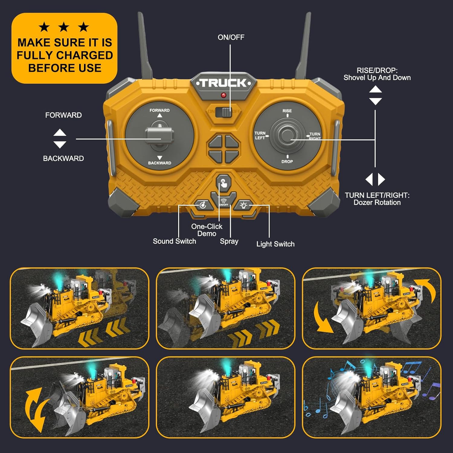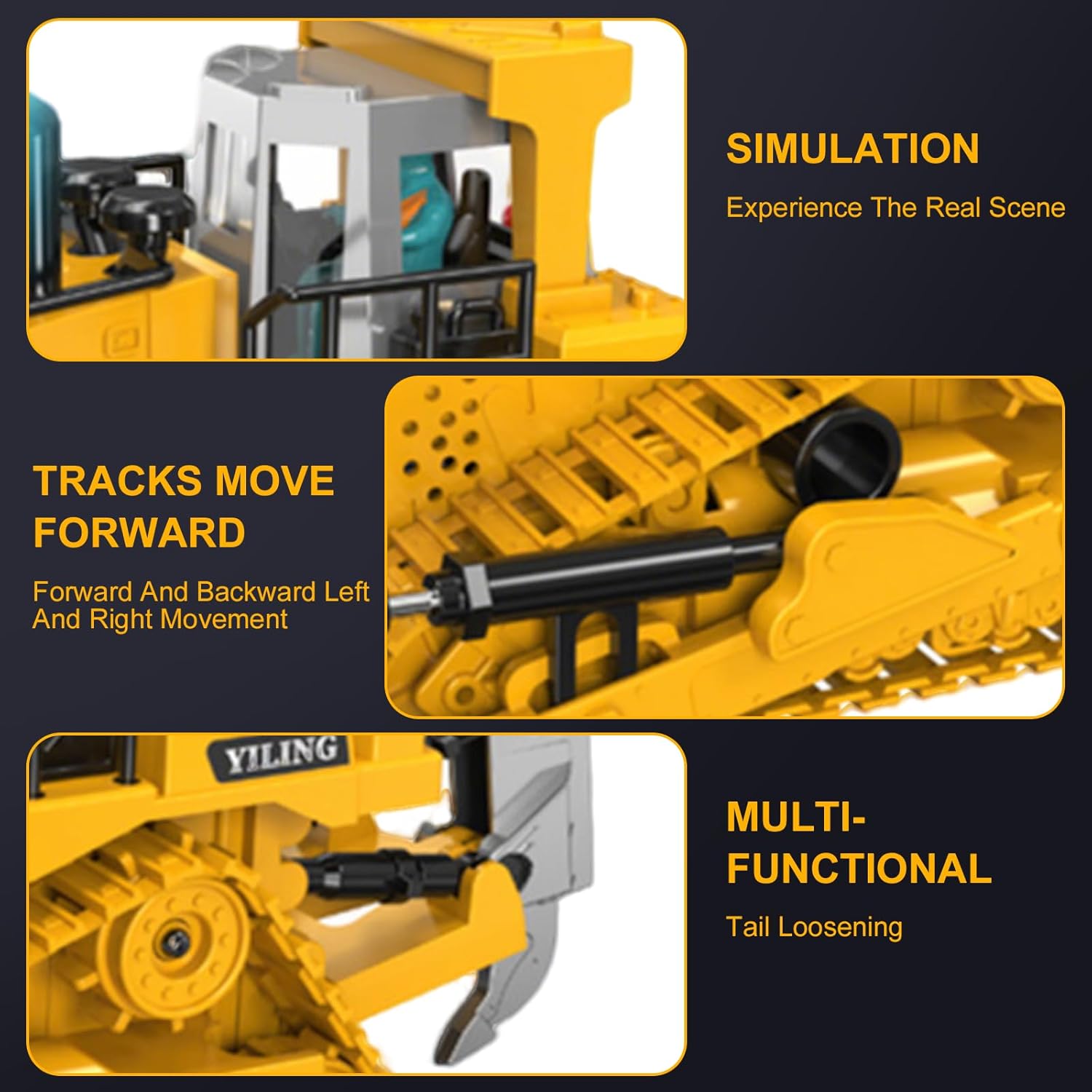 • Многофункционален: Този булдозер с дистанционно управление е оборудван с 9-канална система за управление, която позволява движение напред, назад, надясно и наляво, движение нагоре/надолу, въртене на 360°, демонстрация с едно докосване, реалистична музика и симулирано осветление, осигуряващи гъвкава работа.