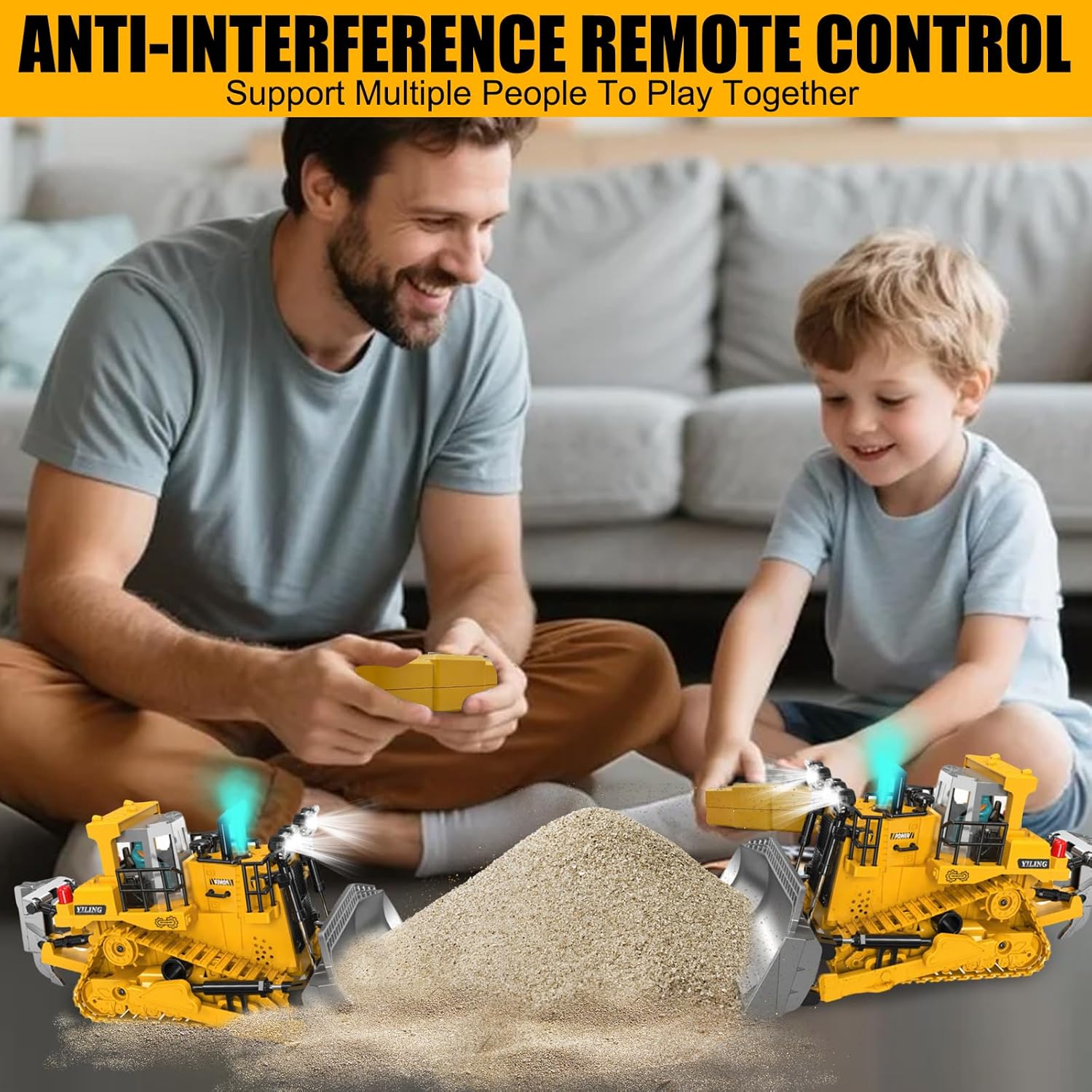 • 【2.4GHz Дистанционно управление】: Този булдозер с дистанционно управление разполага с безжично дистанционно управление 2.4GHz без смущения и безжично инфрачервено дистанционно управление, което позволява лесното му управление във всяка посока. Могат да се управляват множество дистанционно управлявани превозни средства.