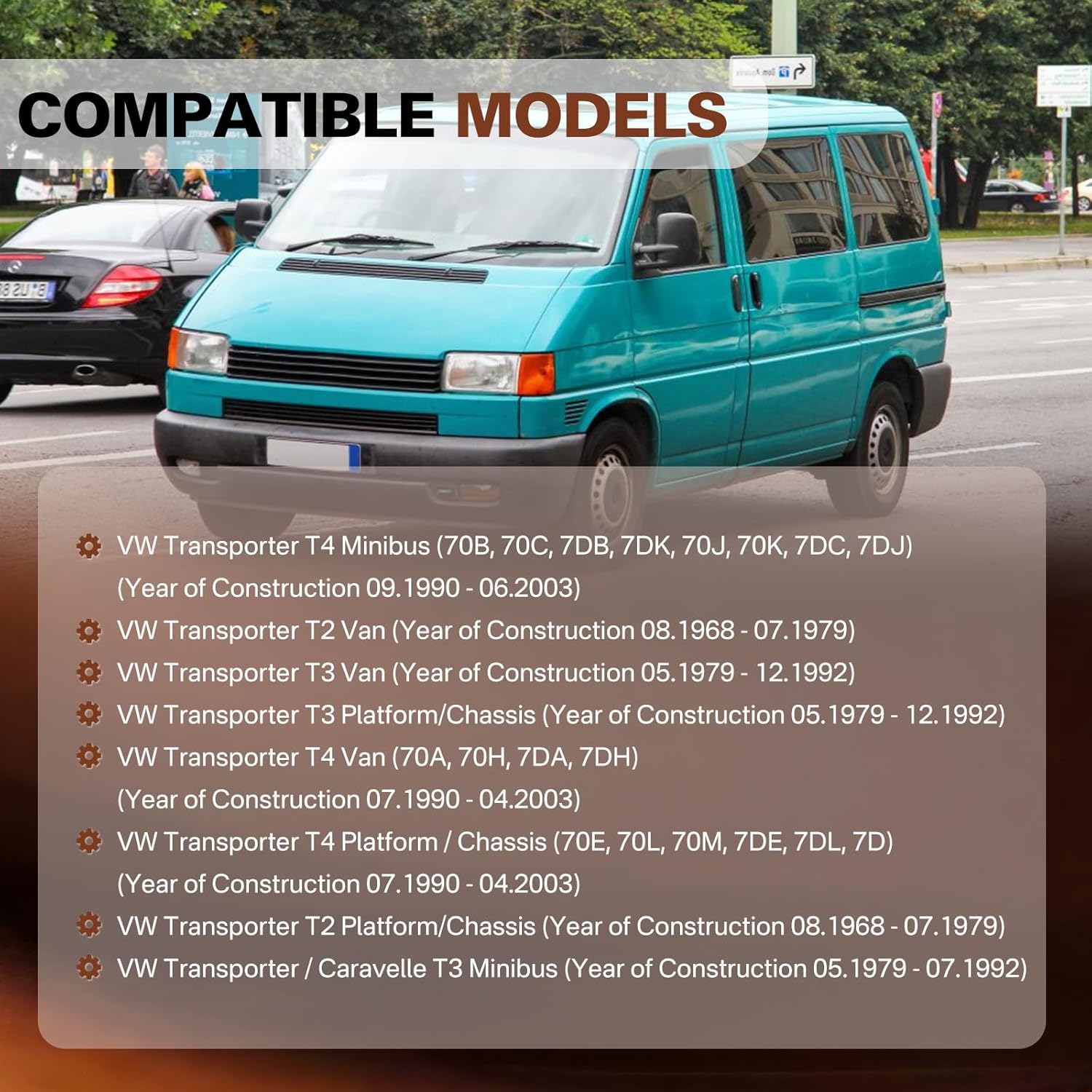 • Описание: Този задвижващ механизъм за централно заключване е подходящ за VW Transporter T4 бордова платформа/шаси (70E, 70L, 70M, 7DE, 7DL, 7D) (моделни години 07.1990 - 04.2003); VW Transporter T2 бордова платформа/шаси (моделни години 08.1968 - 07.1979); VW Transporter / Caravelle T3 микробус (моделни години 05.1979 - 07.1992).