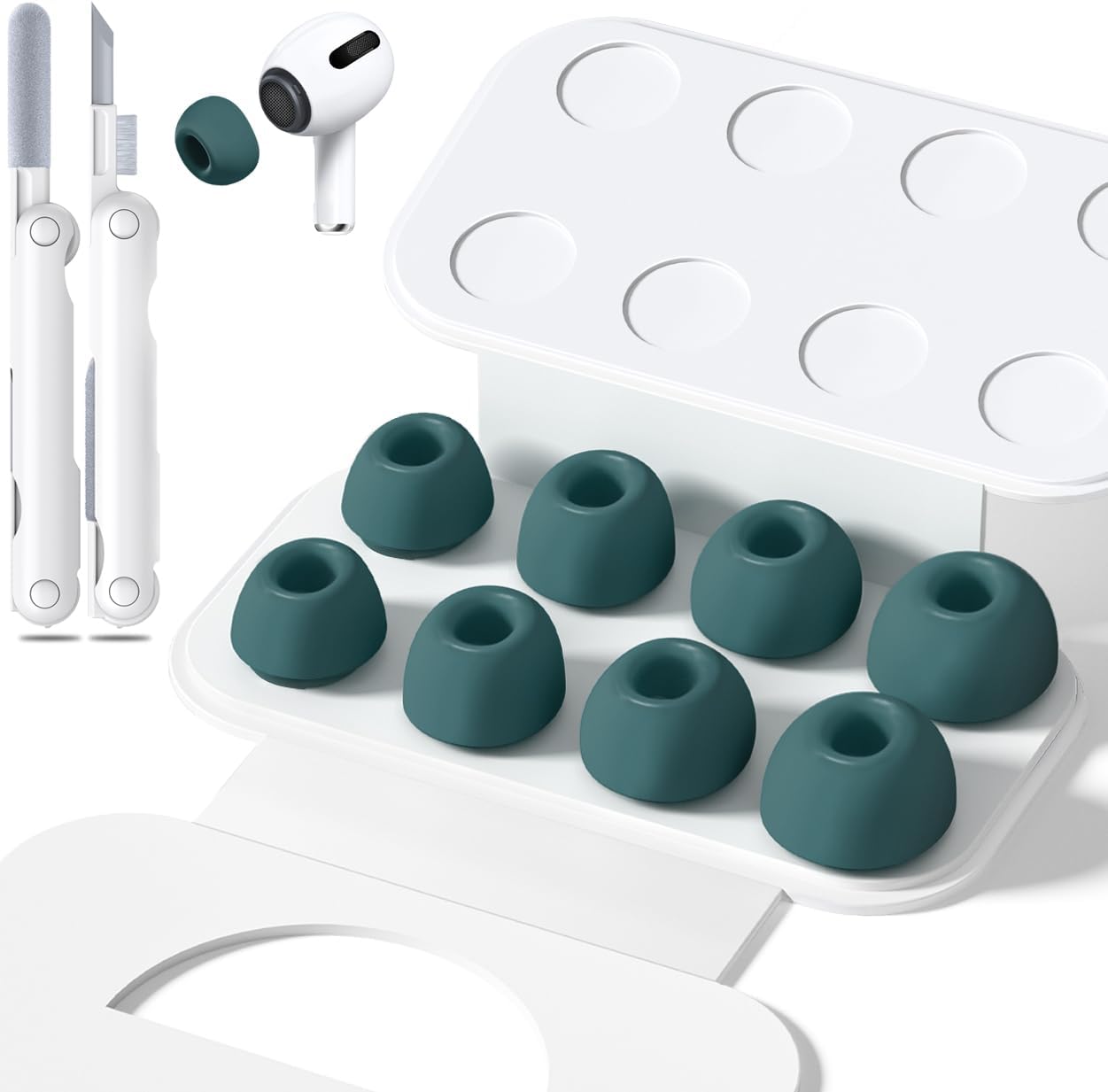 4 чифта резервни накрайници за уши за Airpods Pro 1/2 с отвор за намаляване на шума, силиконови тапи за уши за Airpods Pro с комплект за почистване и преносима кутия за съхранение, 4 размера (XS/S/M/L) борово зелено