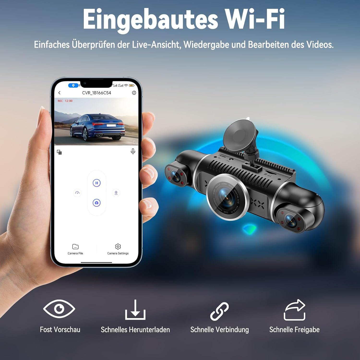 • 【Integriertes WLAN/APP-Steuerung】 Die Autokameras verbindet sich über integriertes 2.4G Hz WLAN mit der App, ohne dass eine Datenübertragung erforderlich ist. Auto Kamera 360 Grad überwachung Über die Smartphone-App können Sie Bilder in Echtzeit anzeigen, wiedergeben sowie Ihre aufgenommenen Videos herunterladen und verwalten. Mit nur einem Klick können Sie Ihre Reisen und schönen Momente mit Freunden und Familie teilen.Unsere dashcam auto vorne hinten sind die ideale Wahl für Taxi-/Fahrdienstvermittlungsplattformen, Transportfahrzeuge, gewerbliche Fuhrparkfahrer und Privatanwender