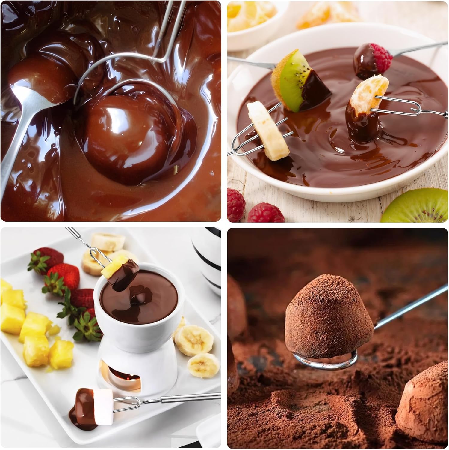 • Многофункционални приложения: 4 вилици и лъжици с различни размери са предназначени за потапяне на топки за торта, плодове, сладкиши и ядки в шоколад и глазура; практични инструменти за ръчно приготвен шоколад, сладкиши, ядки и трюфели.