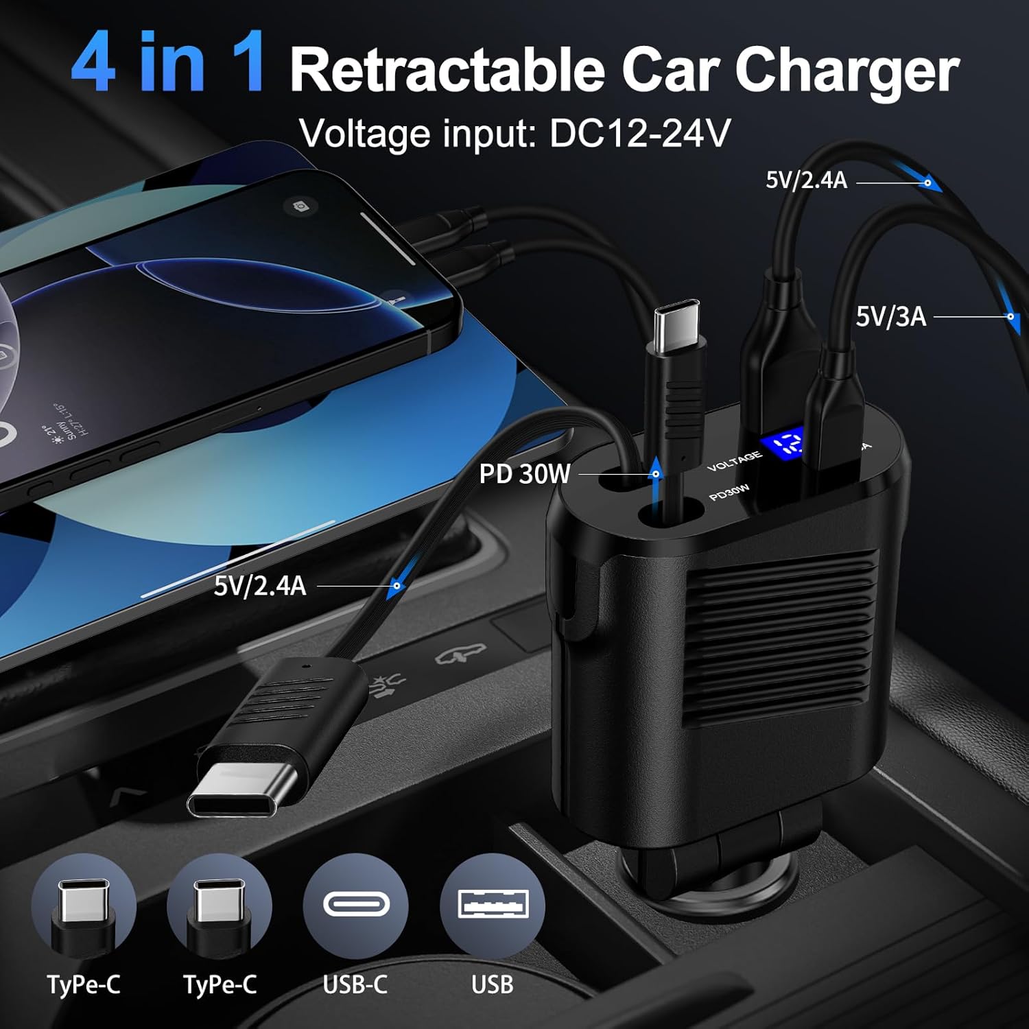 This 4-in-1 car fast charger is equipped with 2 USB ports (USB-A 12W + USB-C 15W), a 30W USB-C retractable cable and a 12W USB-C retractable cable (maximum 80 cm long extended) and can charge 4 devices at the same time.