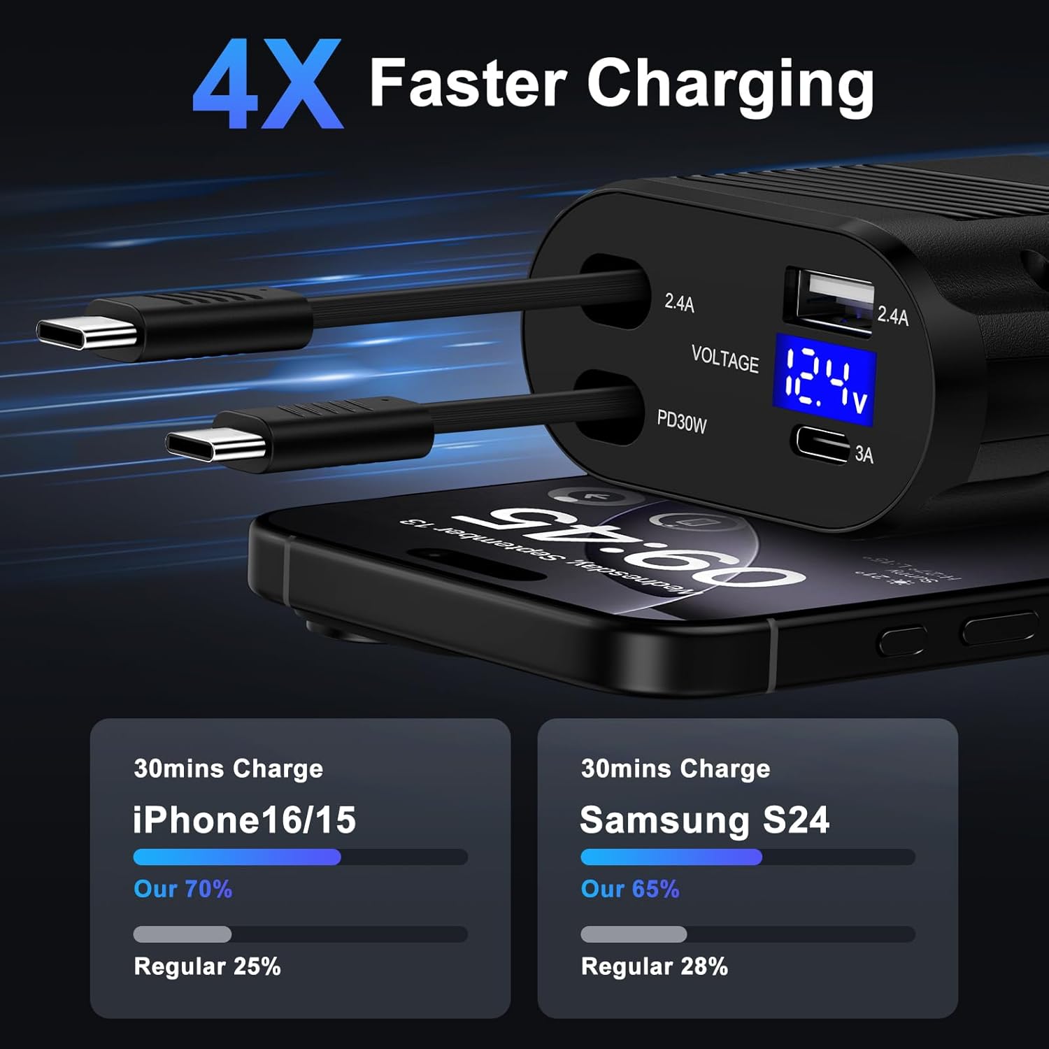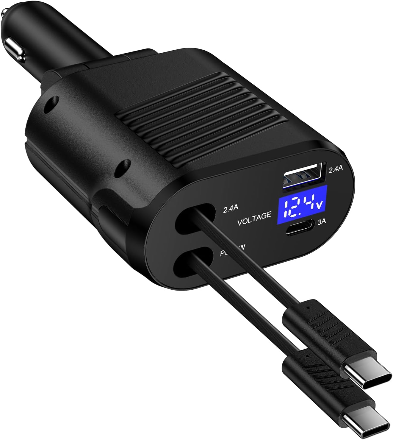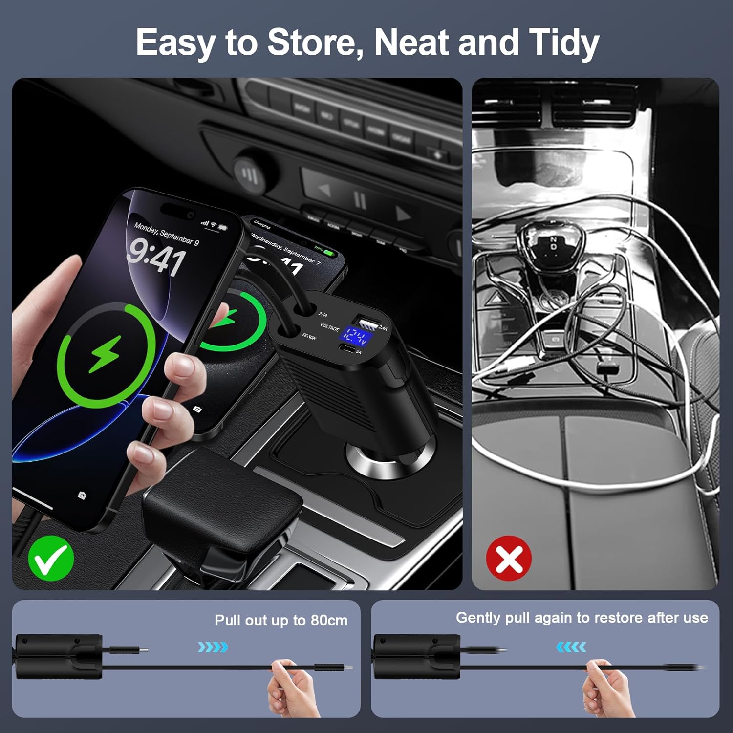 This car charger is equipped with two Type-C retractable cables that can be extended up to 80 cm long and are automatically retracted after use
