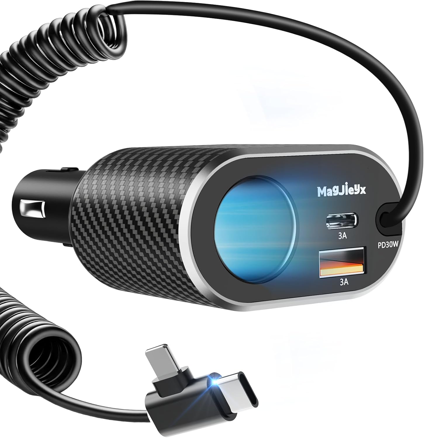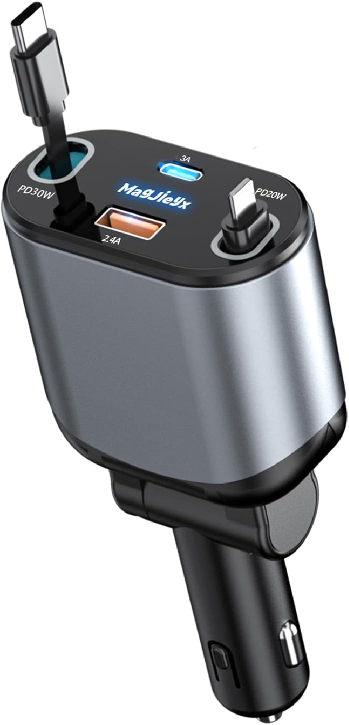 • 4-портово реално PD 3.0 бързо зареждане: Изпитайте светкавично бързо зареждане до 80W с истински ДВА ПРИБИРАЩИ СЕ КАБЕЛА PD 3.0 TYPE C, което го прави един от най-бързите адаптери за зарядни за кола на пазара. Неговите PD 30W и PD 20W Type-C кабели, както и 15W USB A/C портове, осигуряват бързо зареждане на всички ваши устройства. (Забележка: Това зарядно за кола е само за зареждане и не може да се използва за CarPlay.)
