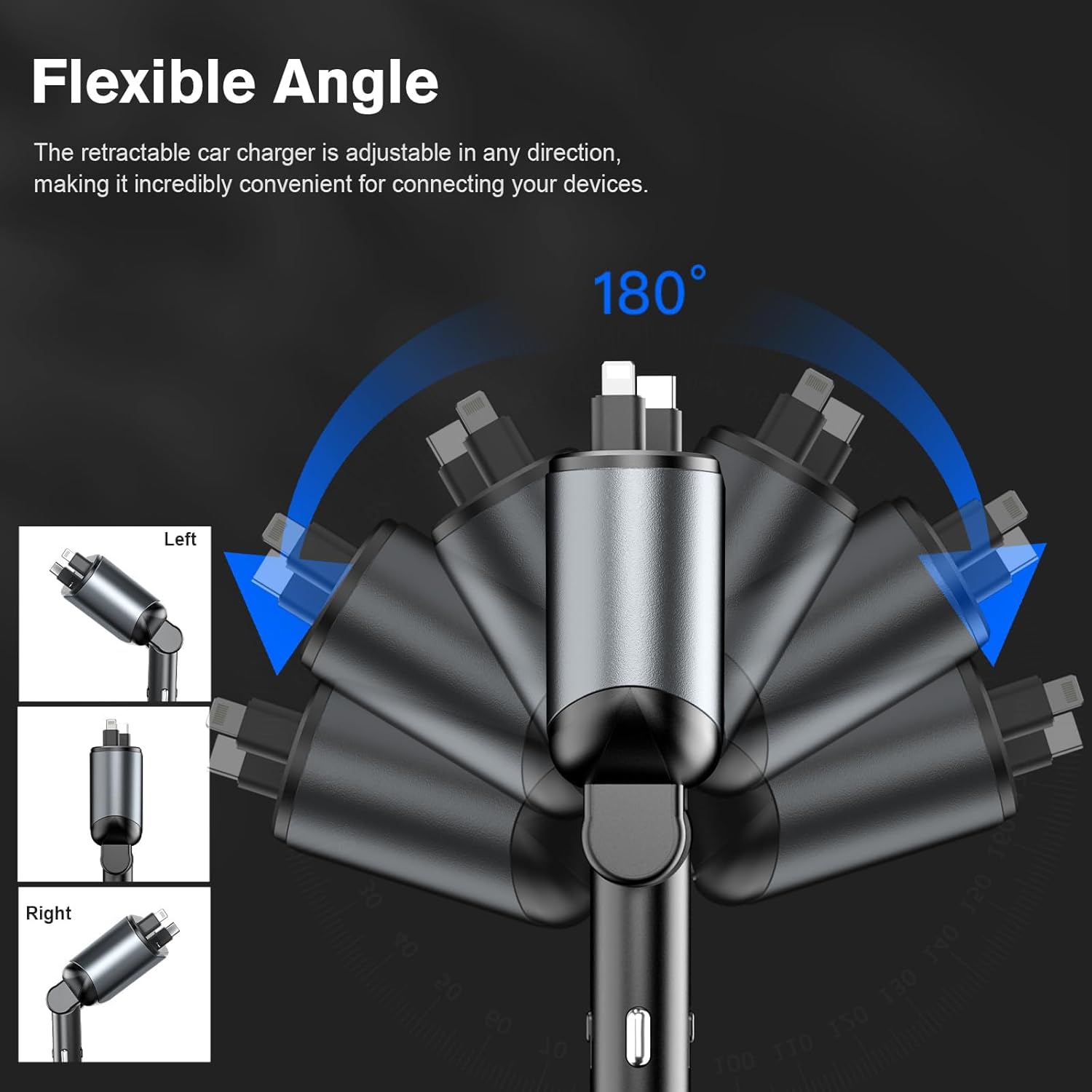 • ИЗДРЪЖЛИВ И БЕЗОПАСЕН КАБЕЛ БЕЗ ЗАПЛИТАНЕ Това 4 в 1 зарядно за кола удължава кабела до 31,5 инча и автоматично се прибира, за да го поддържа подреден. Подобреният кабел за зареждане е по-дебел и по-издръжлив и осигурява по-бързи скорости на зареждане в сравнение с конвенционалните зарядни за кола.