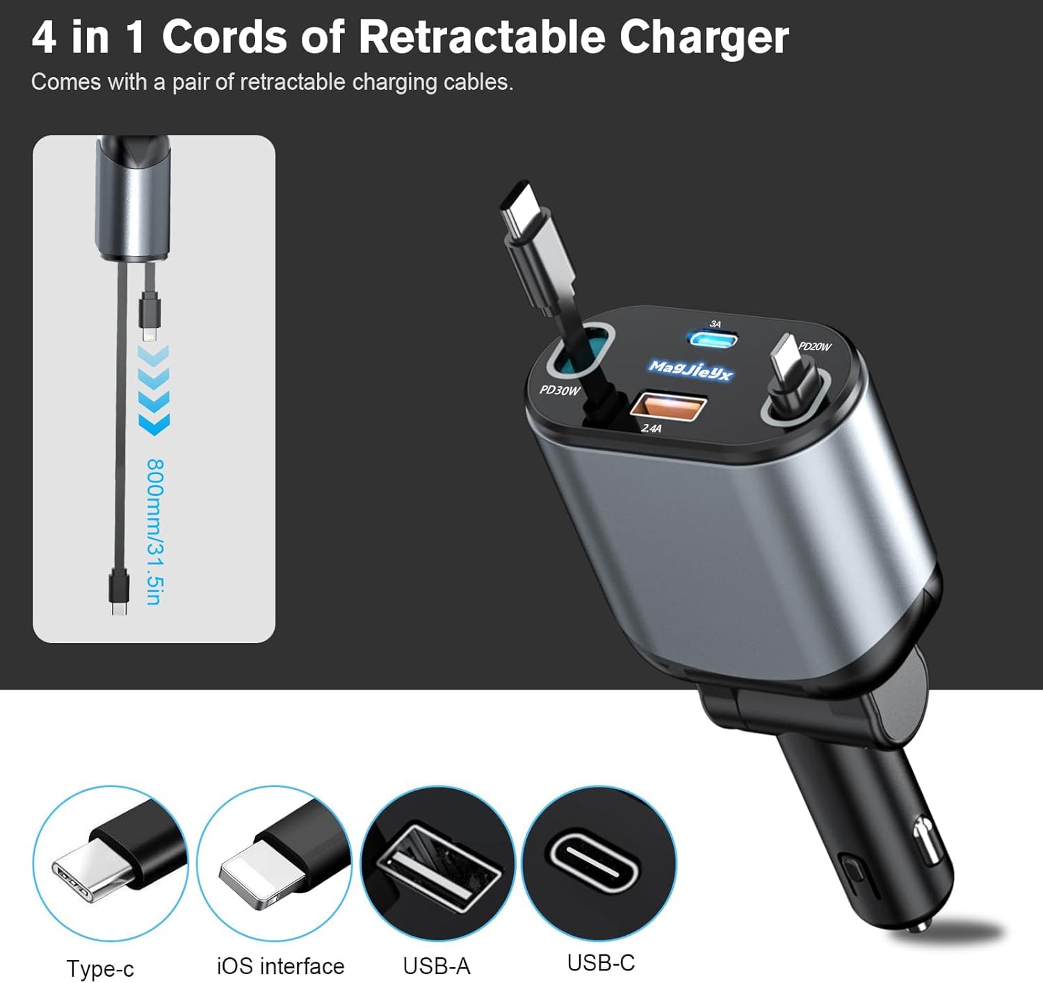 4-в-1 USB C кабел за запалка, прибиращо се зарядно за кола, 80 W бързо зарядно за кола (кабел за зареждане Type-C/USB-i, USB-A/C порт) за iPhone 16/15/14/13 Pro Max Plus, Galaxy, аксесоари за кола