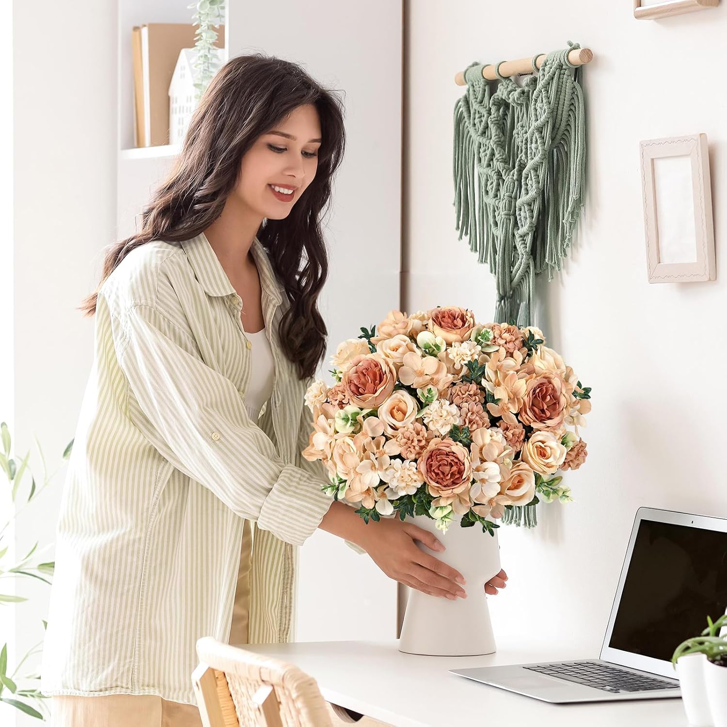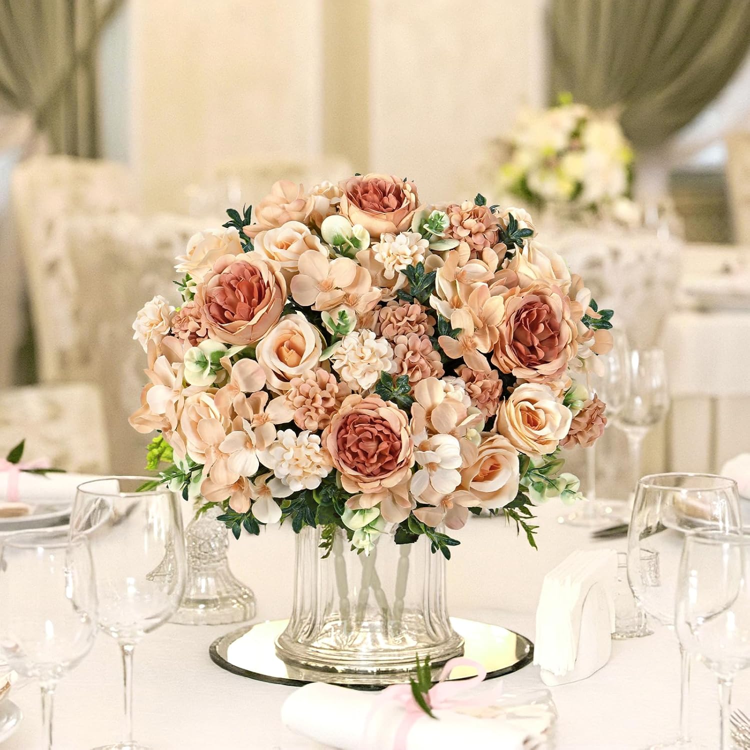 Worked perfectly for decorating kitchen tables at home. Faux silk peony roses look lifelike and elegant. Easy to decorate. Perfect for someone with no previous experience in arranging flowers