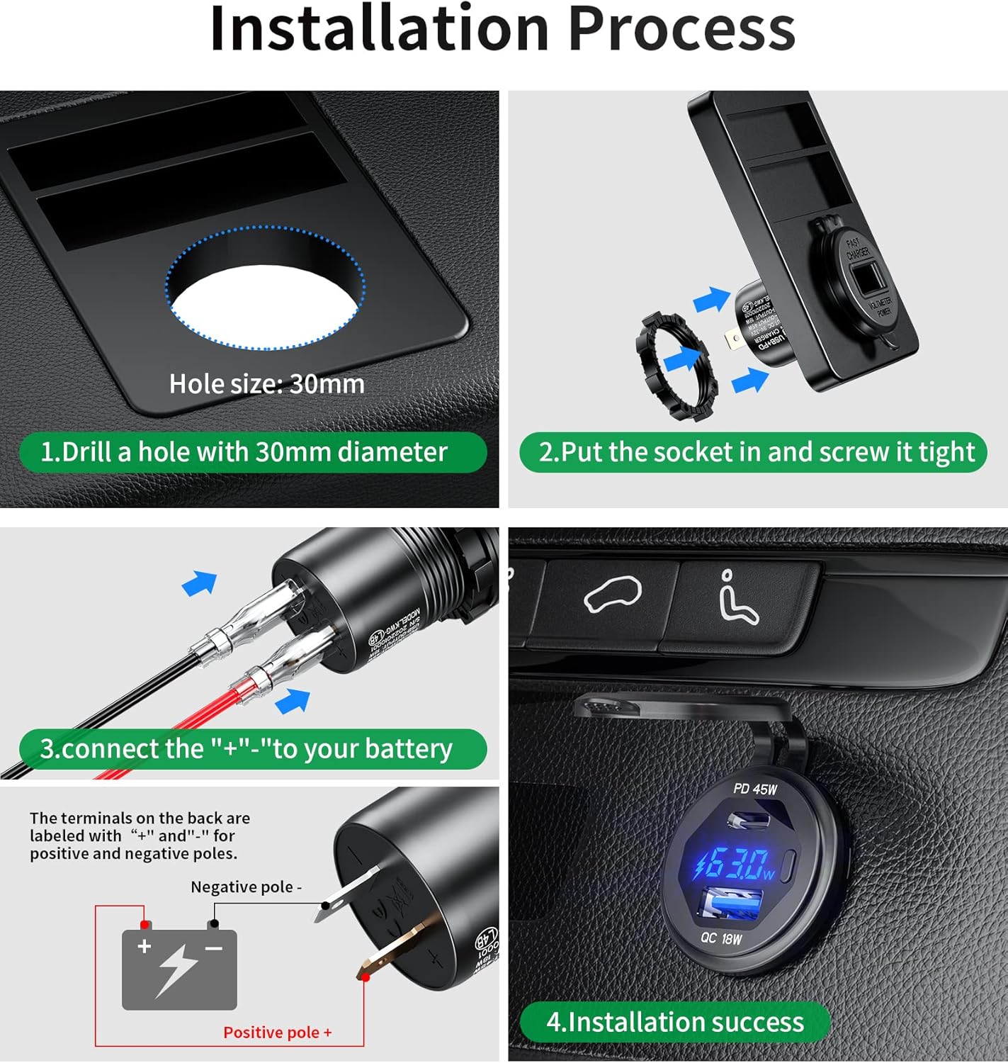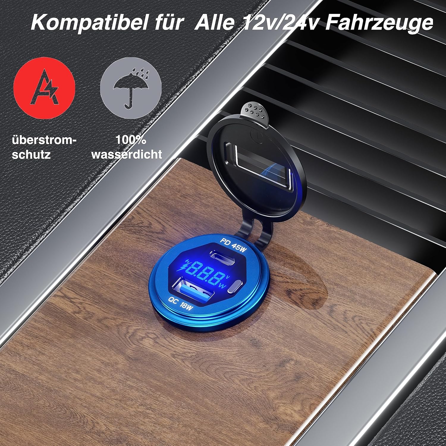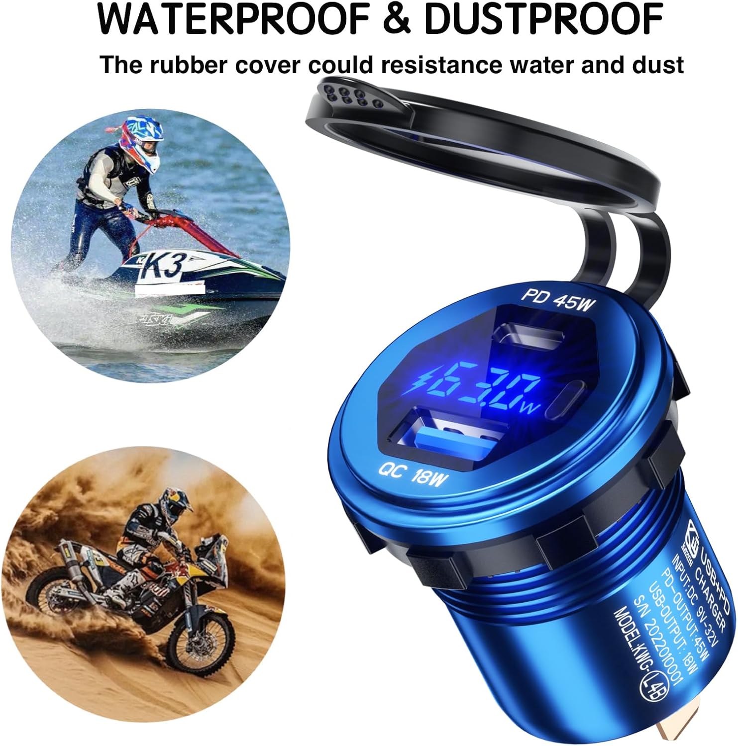 • Водоустойчив вграден контакт: Този USB порт за монтаж на плоча е снабден с напълно запечатана защитна капачка, която е 100% водоустойчива и прахоустойчива. Водоустойчивост IP66, работи перфектно на кораби, автомобили, лодки, велосипеди, SUV, ATV, кемпери, кемпери и мотоциклети. Съвместим е с повечето превозни средства с напрежение DC 12-24V.