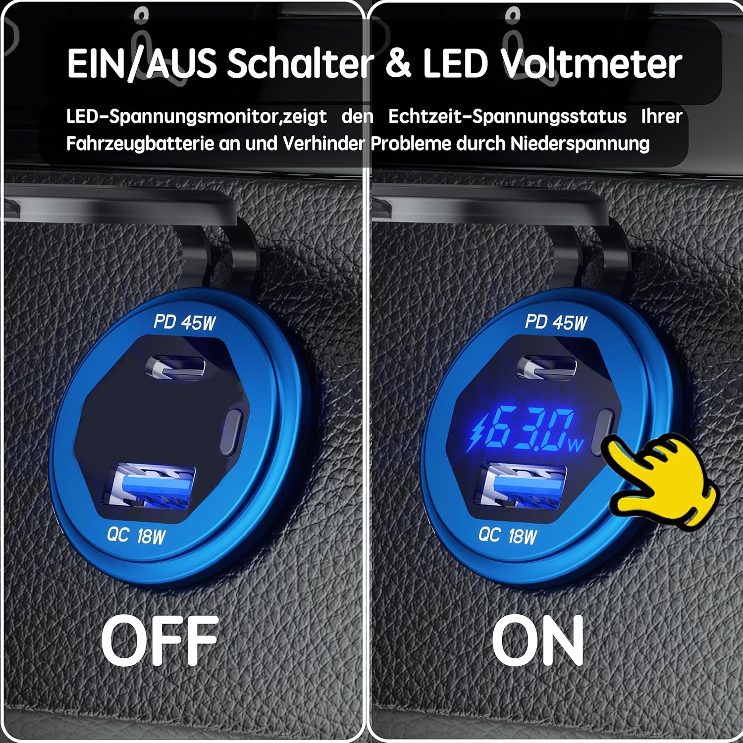45W USB C гнездо 12V Quick Charge 3.0 зарядно за кола с превключвател за мотоциклет, каравана, лодка, камион