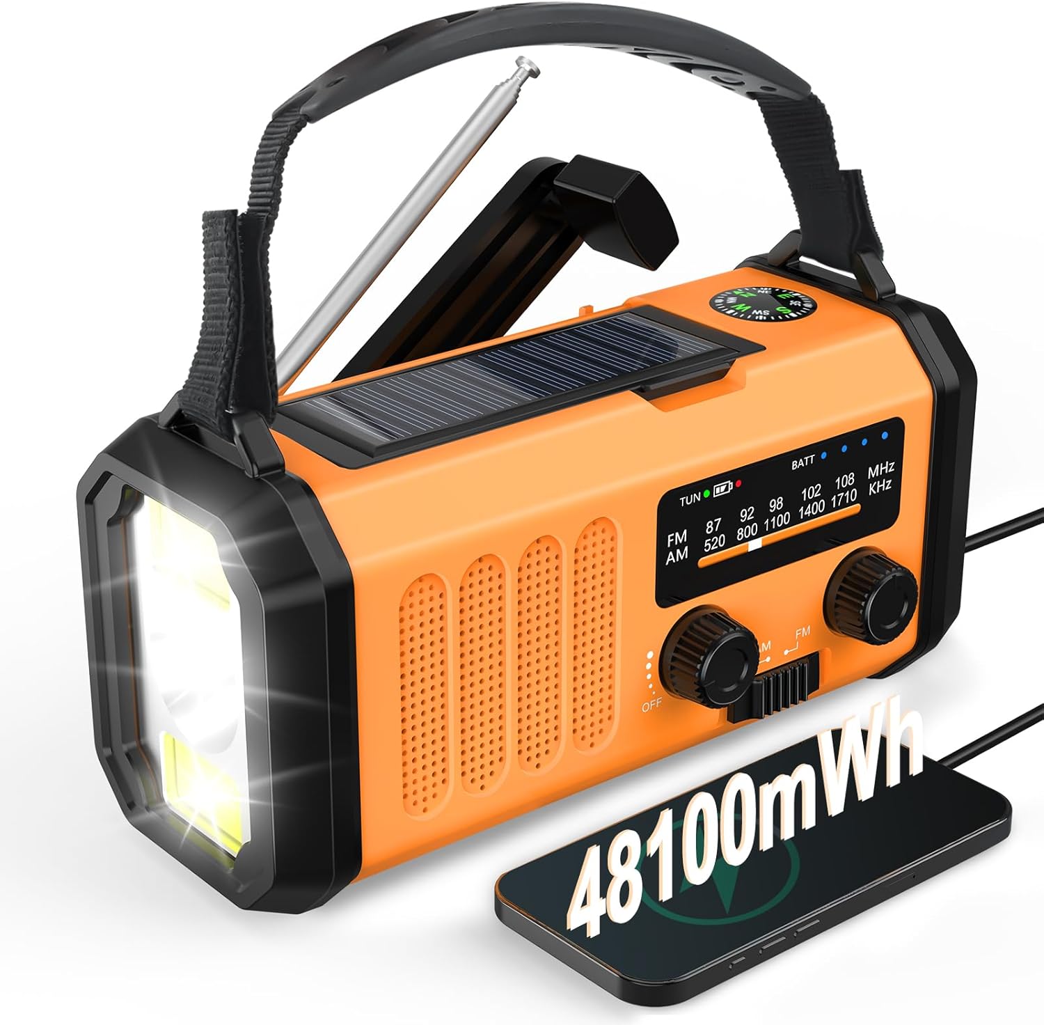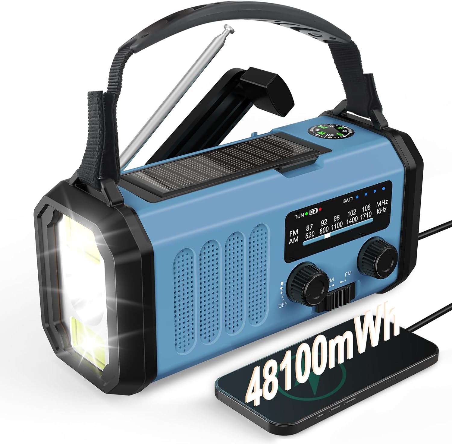 48100 mWh радиостанция с манивела, слънчево радио със световен приемник, AM FM радио, динамо радио за спешни случаи със зарядно за мобилен телефон, акумулаторна фенерче и лампа за четене, компас, SOS при прекъсване на захранването