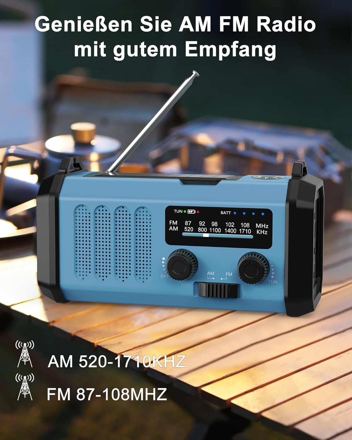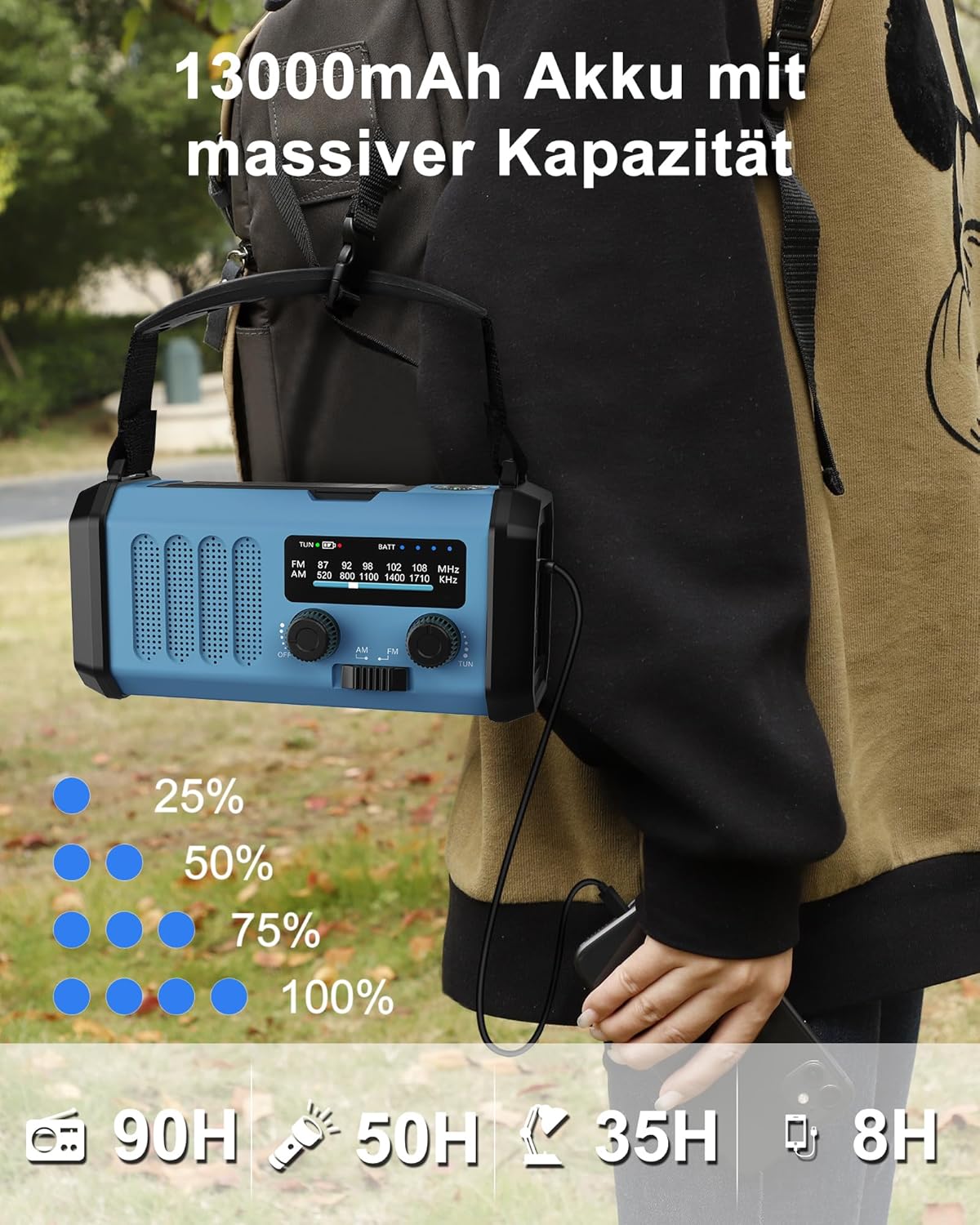 • Практично зарядно устройство за спешни случаи с капацитет 13000 mAh: радиото, работещо с батерии, с подобрена батерия от 13000 mAh с голям капацитет. Това аварийно радио винаги поддържа мобилния ви телефон онлайн в случай на спешност и успокоява тези, които се тревожат за вас. Освен това, радиото с батерии е чудесна алтернатива за любителите на дейности на открито и комплект за спешни случаи, който можете да вземете със себе си за всички ваши пътувания, като къмпинг, туризъм, риболов или други дейности на открито.